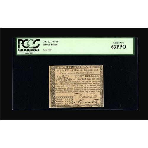 <B>Rhode Island July 2, 1780 $8 PCGS Choice New 63PPQ.</B></I> An attractive issue with slightly better paper quality than is usually seen on this issue. The signatures remain bold.<BR><BR><b>Shipping:</b> Coins & Currency (<a target="_blank" href="http://www.heritageauctions.com/common/shipping.php">view shipping information</a>)