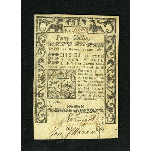 <B>Rhode Island May 1786 40s New.</B></I> Some corner mounting remnants are seen on this well margined Rhode Island note.<BR><BR><b>Shipping:</b> Coins & Currency (<a target="_blank" href="http://www.heritageauctions.com/common/shipping.php">view shipping information</a>)