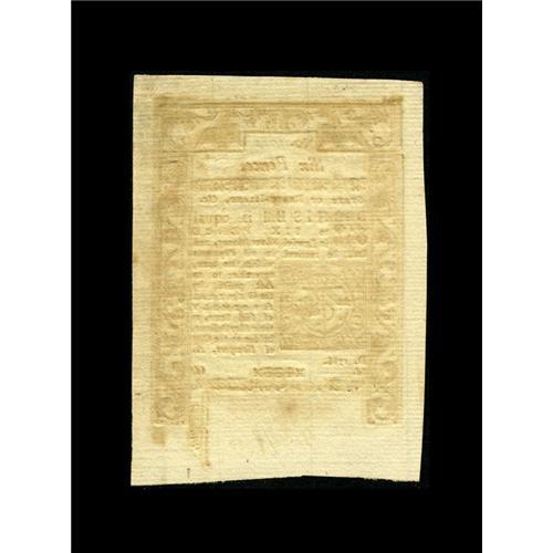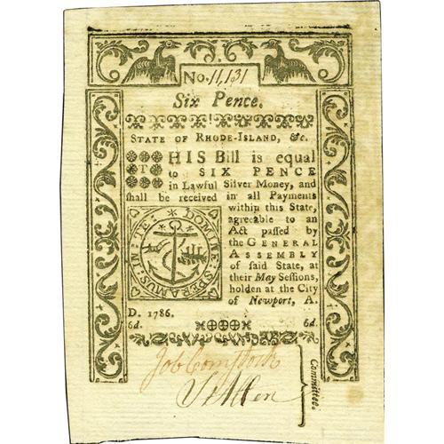 <B>Rhode Island May 1786 6d Gem New.</B></I> This is a beautiful note with bold embossing and wide margins. The paper has aged slightly, but this only adds to the charm of this note. A Colonial American Coin Club authenticity certificate signed by Walter Breen is included.