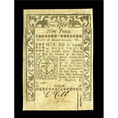 Rhode Island May 1786 9d Extremely Fine. A nice problem Rhode Island May 1786 9d Extremely Fine.