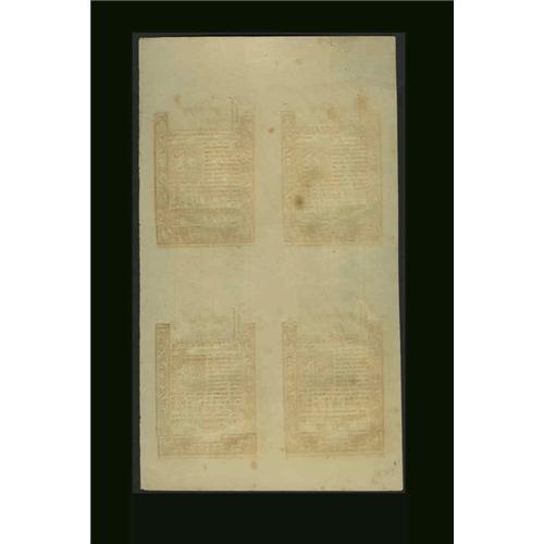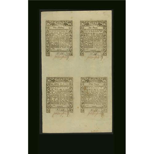 <B>Rhode Island May 1786 Half Sheet of Four Superb Gem New.</B></I> One each of the 6d, 9d, 1s, 2s6d notes. All four are Superb broadly margined Gems.