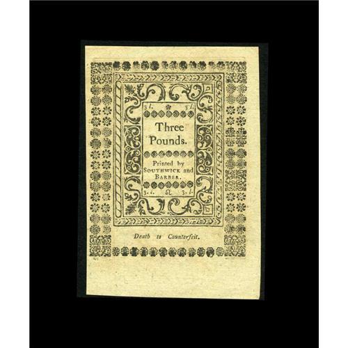 <B>Rhode Island May 1786 L3 Choice About New.</B></I> This L3 note carries three signatures and is printed on both sides unlike the lower denominations of this issue. The note has the appearance of a Gem, but there is a single light centerfold.