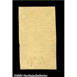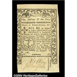 Rhode Island May 1786 New. Two notes, a 6d and a 2s6d, both of which grade fully uncirculated and are well signed and numbered. Both notes share the same serial number, indicating that they came from the same original sheet; both notes are well margined top and bottom, but poorly margined on the sides, with the design being touched in a few places. 2 notes <BR><BR><B>Important notice:</B> Heritage usually auctions material at the rate of 200-250 lots per hour. On some occasions eBay Live bid software or the Internet may not be able to keep up with the pace of the auction. We recommend placing a realistic absentee bid now as insurance to avoid disappointment. Occasionally the auctioneer may eliminate or reject an eBay Live bid, and the auctioneer may also reopen a lot after the close of the eBay live bidding (usually because we missed an audience bid), and may reject your bid even if it shows you as the winning bidder. By bidding via eBay Live, you agree that Heritage may award the lot to another bidder at its sole discretion under the circumstances described above or any other reasonable circumstances. Since eBay bids are not shown to us until we open the lot on the floor, we treat those bids just like floor bids. In most cases the floor responds before the eBay bid is presented to us, due to Internet lag time, so for consistency we have made it a policy that floor bids are always considered first over tie eBay live bids. Also please note that all Heritage lots purchased through eBay Live carry a 20% Buyer's Premium. Please make sure you read the Terms and Conditions before you bid. <BR><BR><B>IMPORTANT ANNOUNCEMENT ABOUT RESERVES:</B> Heritage now divulges all reserves on its web site 7 days before every auction. If you want to know whether the reserve on this lot has been met, and if not, what the reserve amount is, please visit this lot page on the HeritageCoin.com web site, or email: bid@HeritageGalleries.com