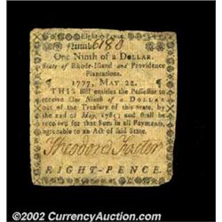 Rhode Island May 22, 1777 $1/9 Very Fine. There are some minor restorations, particularly at the cor