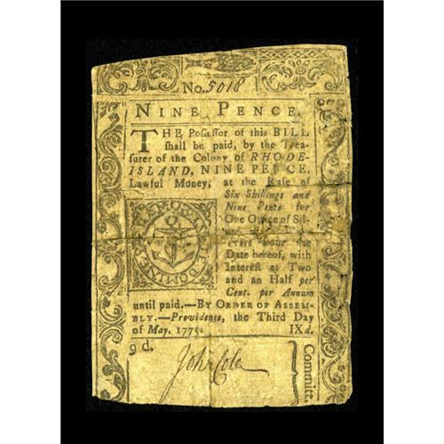 Rhode Island May 3, 1775 9d Fine, Repairs. This is a v