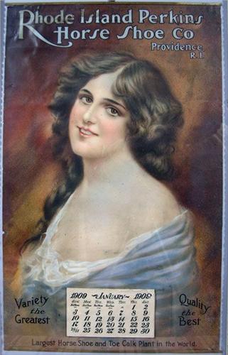 Rhode Island Perkins Horseshoe Company 1909 calendar. When was the last time you saw a pretty lady advertising Horse Shoes? Print dated 1902, calendar pad may not be original. Original bands top and bottom, wrinkles, creases and minor touch up otherwise very good condition. 14 X 22 inches image only.