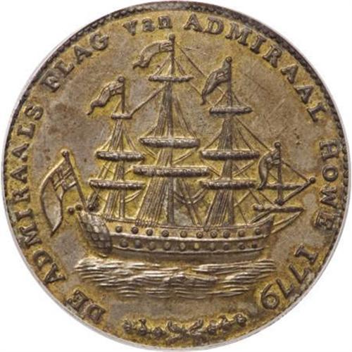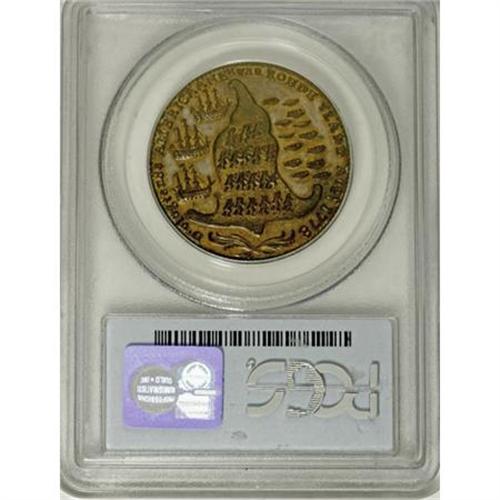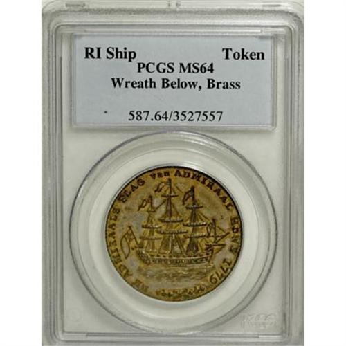 <B>(1778-1779) Rhode Island Ship Token, Wreath Below, Brass MS64 PCGS.</B></I> Breen-1141. Betts-563. This impressive example retains its initial brassy green-gold iridescence within the letters and ship's rigging, while the open fields have toned cream-gray. Well preserved aside from a hair-thin mark between the upper two flags. Listed on page 48 of the 2008 Guide Book. Population: 2 in 64, 0 finer (8/07).<BR><BR><b>Shipping:</b> Coins & Currency (<a target="_blank" href="http://www.heritageauctions.com/common/shipping.php">view shipping information</a>)