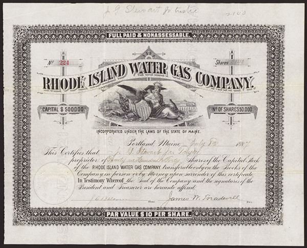 Maine. 2140 Shares I/U Stock Certificate. Black print with black ornate border. Vignette of a reclined woman with eagle and shield including harbor and locomotive moving over bridge in the distance, Fine condition.