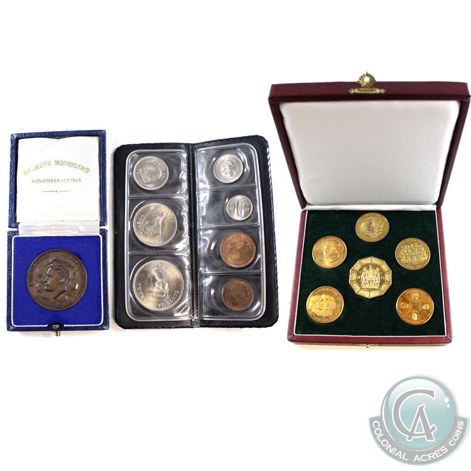 Rhodesia Issue: Lot of Rhodesian Coin Sets. You will receive a 6-coin Medallion set Commemorating the Rhodesian independence in large display case (case hinges are broken & medallions are toned), a 1965 Rhodesian independence Copper medal in original blue display case and a Coins of Rhodesia 7-coin folder. 3pcs