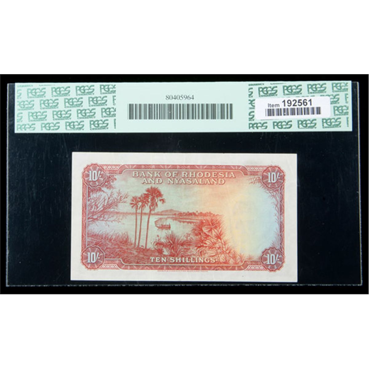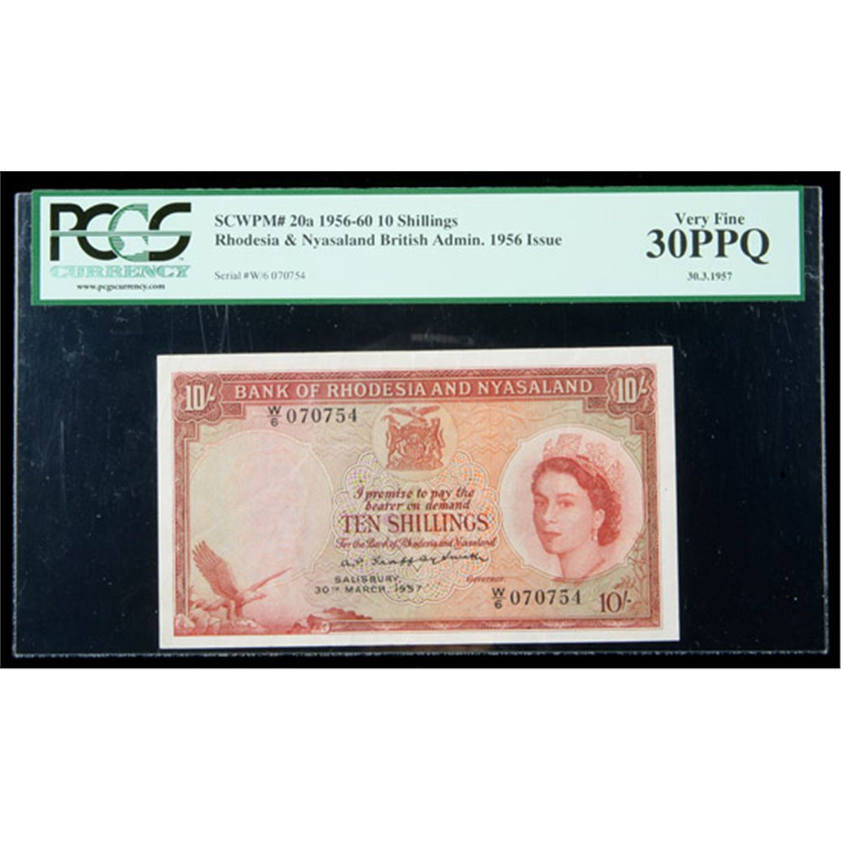 Rhodesia & Nyasaland SCWPM# 20a, 30.3.1957 10 Shillings. PCGS Very Fine 30PPQ. . Fr-P-20a. A second example of this scarce Pick number, not nearly as high grade but still very pleasing and problem-free for the grade.