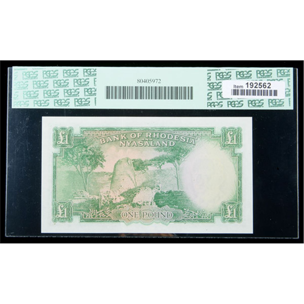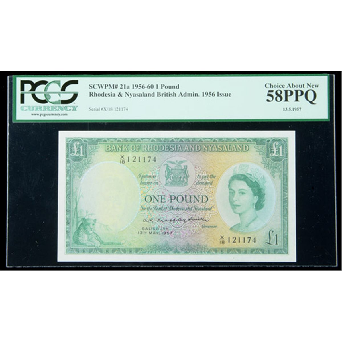 Rhodesia & Nyasaland SCWPM# 21a, 13.5.1957 1 Pound. PCGS Choice About New 58PPQ. . Fr-P-21a. A single light bend is the only flaw on this beautiful and scarce example. This is the finest example of this denomination and issue graded by either major grading service, with the closest a PMG AU50. This Pick number lists at $2400 in "UNC" in the Krause reference, and the final winning bid may very well prove to be close to that valuation.