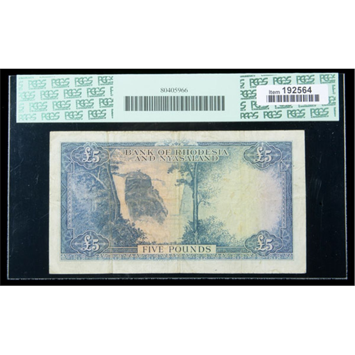 Rhodesia & Nyasaland SCWPM# 22a, 15.4.1957 5 Pounds. PCGS Fine 12. . Fr-P-22a. A lower grade example, but still desirable as any note from this scarce issue is difficult for collectors to locate. Still rather pleasing despite the obvious signs of circulation, and with no major flaws.