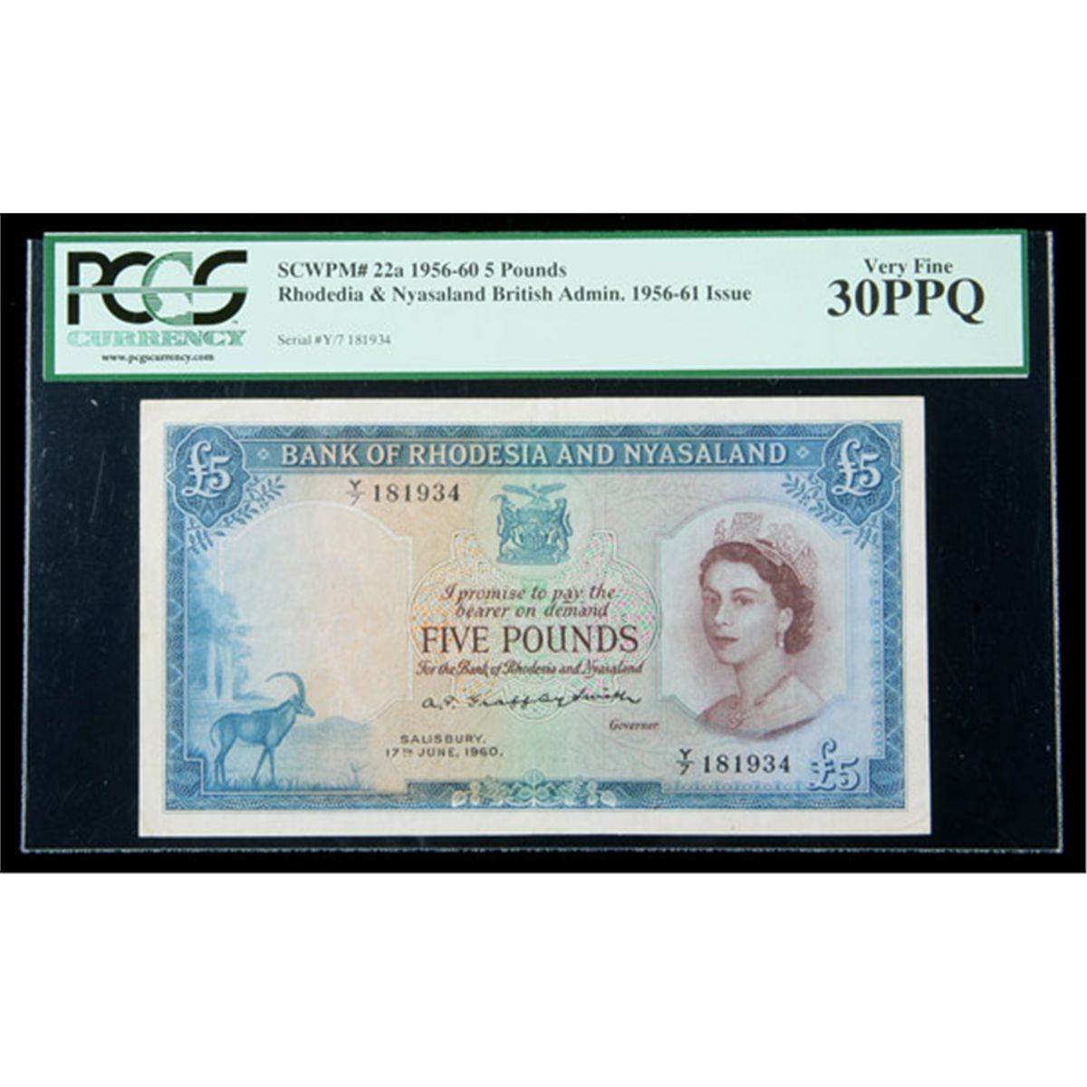 Rhodesia & Nyasaland SCWPM# 22a, 17.6.1960 5 Pounds. PCGS Very Fine 30PPQ. . Fr-P-22a. A problem-free example, with excellent colors, bold originality, and no flaws whatsoever for the grade.