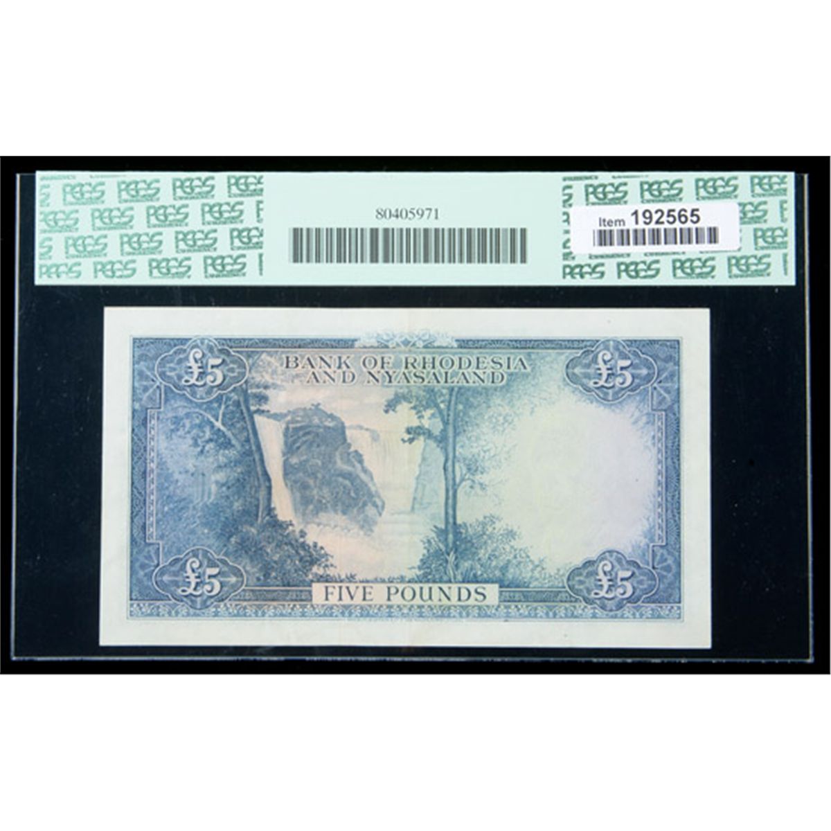 Rhodesia & Nyasaland SCWPM# 22a, 30.3.1957 5 Pounds. PCGS About New 53 Apparent. . Fr-P-22a. While free of much actual circulation, there are a couple of staple holes near the right end that were noted by PCGS Currency and caused the "Apparent" grade. This very scarce Pick number is valued at $1200 in "VF" and $3600 in "UNC" in the Krause reference, and despite the minor flaw this note will still bring a strong winning bid.