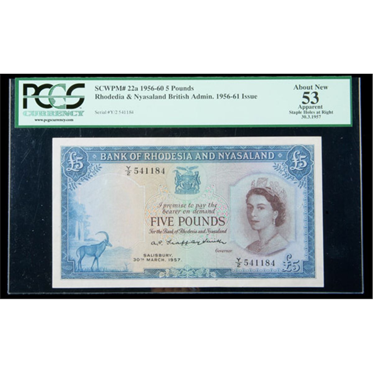 Rhodesia & Nyasaland SCWPM# 22a, 30.3.1957 5 Pounds. PCGS About New 53 Apparent. . Fr-P-22a. While free of much actual circulation, there are a couple of staple holes near the right end that were noted by PCGS Currency and caused the "Apparent" grade. This very scarce Pick number is valued at $1200 in "VF" and $3600 in "UNC" in the Krause reference, and despite the minor flaw this note will still bring a strong winning bid.
