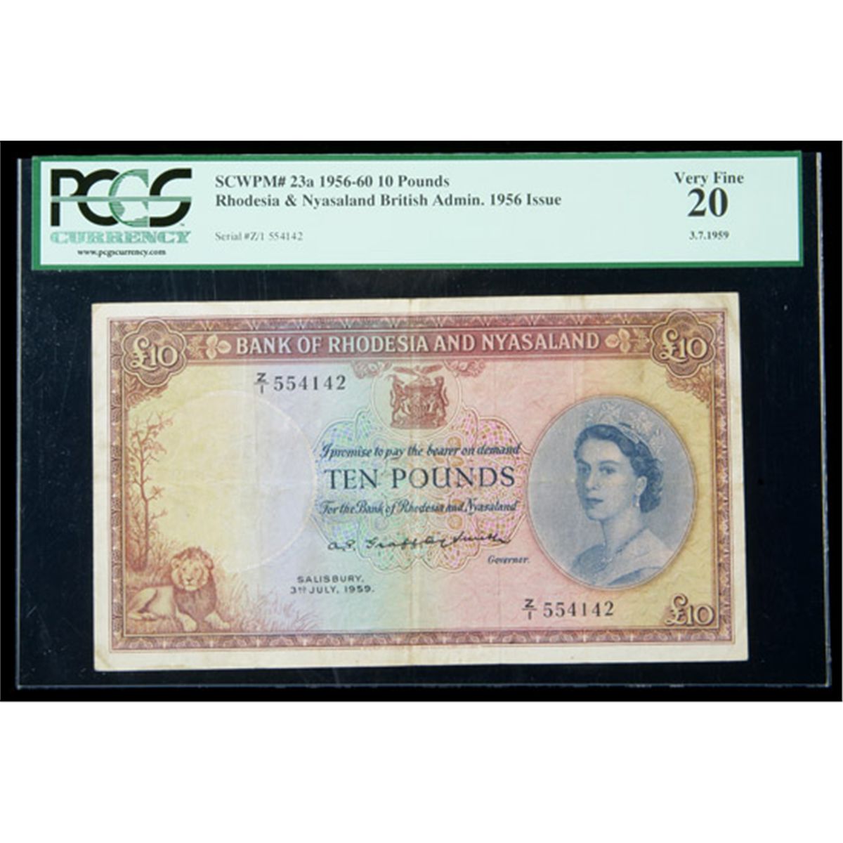 Rhodesia & Nyasaland SCWPM# 23a, 3.7.1959 10 Pounds. PCGS Very Fine 20. . Fr-P-23a. This is a rare denomination that is very seldom seen in any grade. The Krause reference lists a valuation of $3000 in "VF," and lists merely a "--" in uncirculated grade. This piece displays good color and solid paper for the grade, although as with any VF note it has some obvious folds, minor soiling, and normal signs of circulation. With rare World notes in strong demand and commanding higher and higher prices in today's discerning market, we would not at all be surprised if this piece breaks beyond our conservative pre-sale range and sets a new record for this issue.