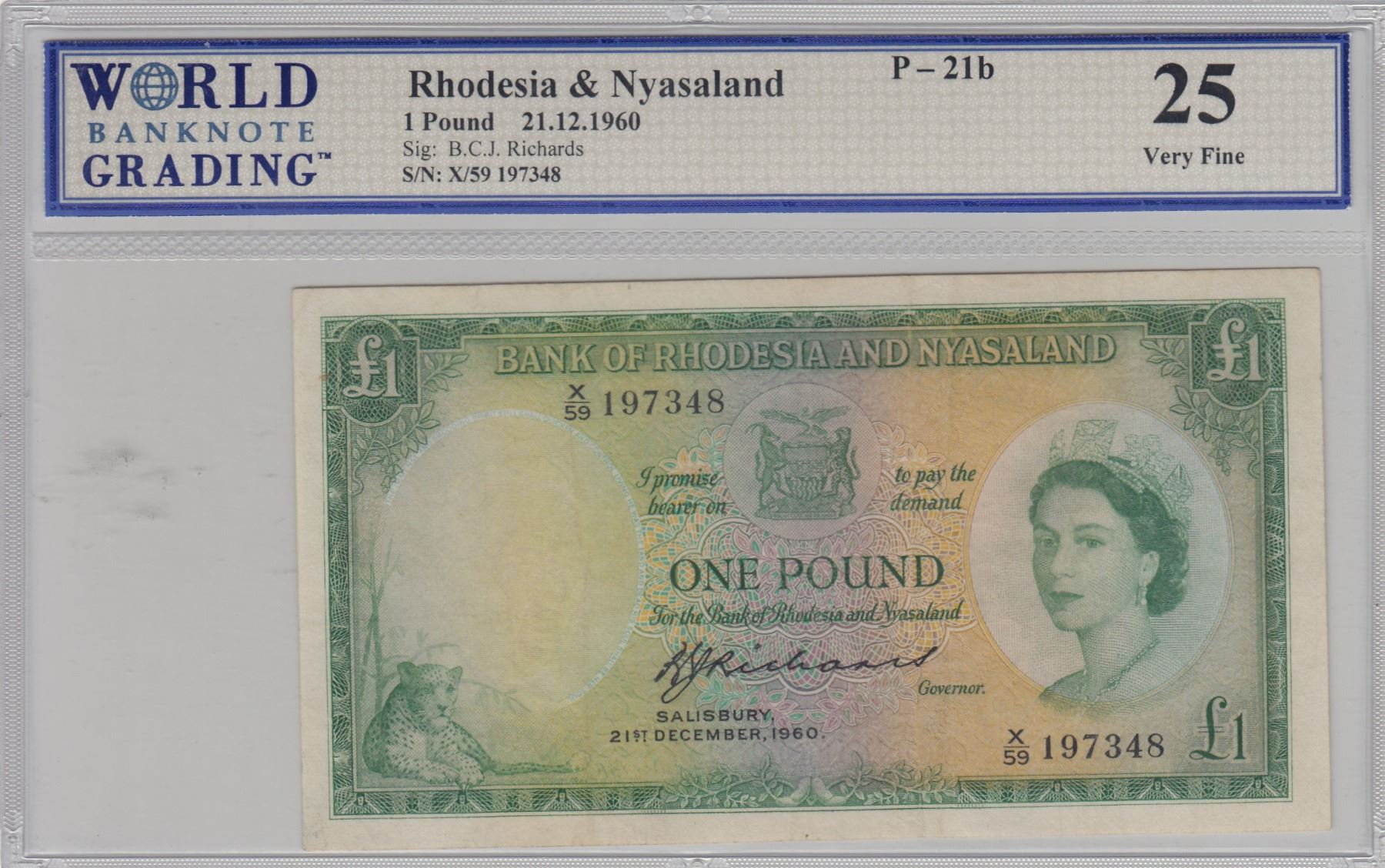 Rhodesia and Nyasaland, 1 Pound, 1960, VF, p21bbr/WBG 25, Queen Elizabeth II portrait, serial number: X/59 197348