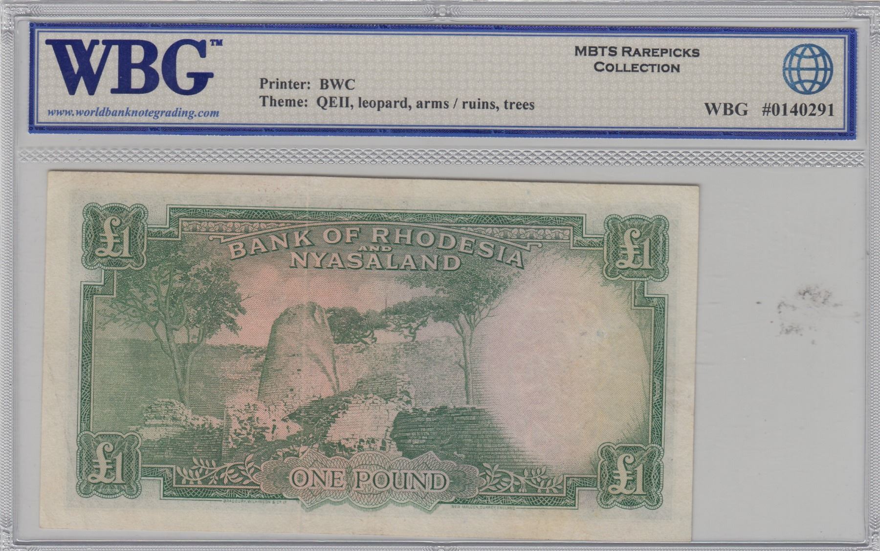 Rhodesia and Nyasaland, 1 Pound, 1960, VF, p21bbr/WBG 25, Queen Elizabeth II portrait, serial number
