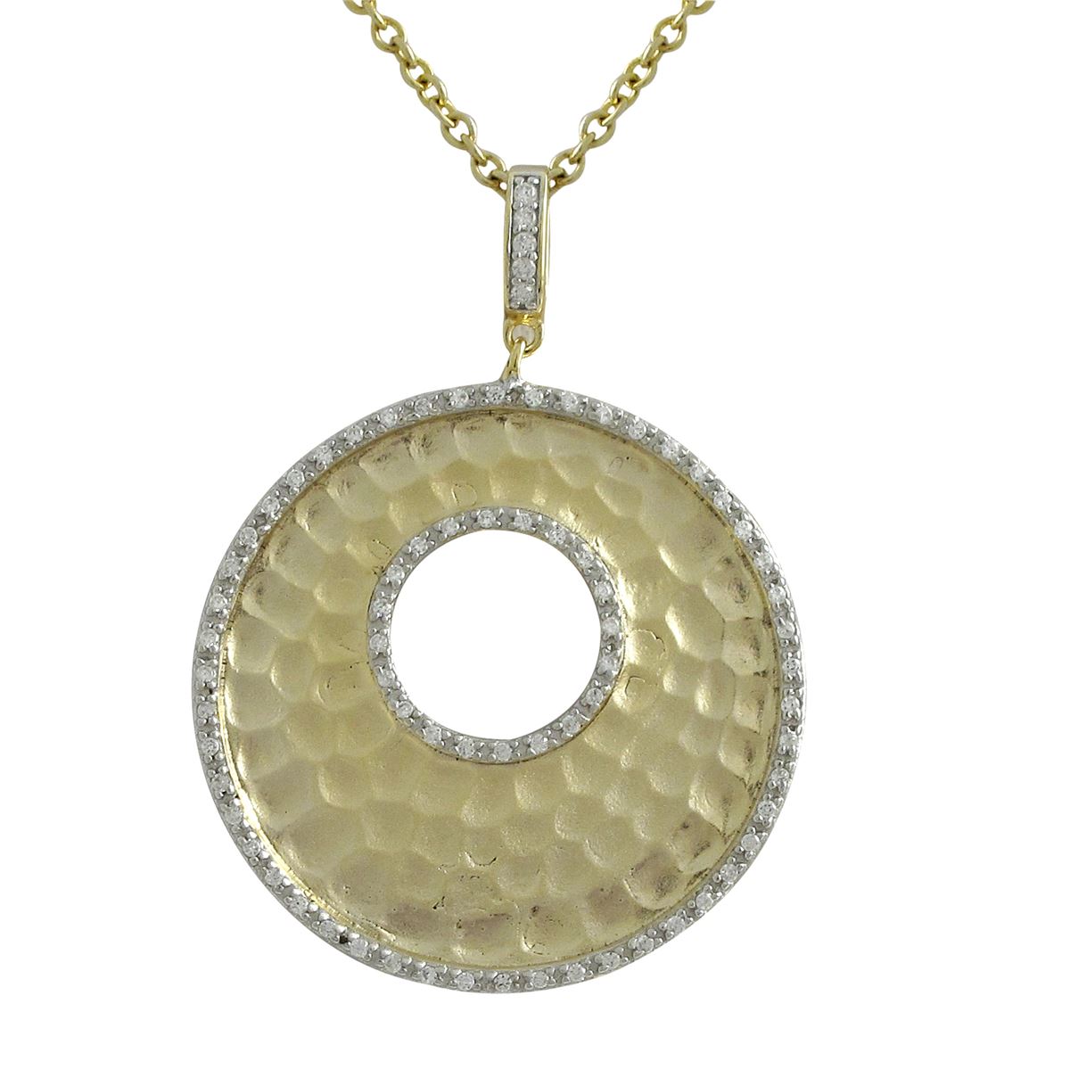 Rhodium And Matte Gold Plating Over Sterling Silver, White CZ, Hammered 32Mm Circle Pendant