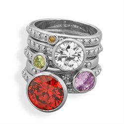 Rhodium plated sterling silver multicolor CZ ring set. There are 5 individual bands. The champagne CZ is 3mm, the yellow CZ is 5mm, the pink CZ is 7mm, the clear CZ is 9mm and the red CZ is 11mm. The bands measure 2.5mm each.