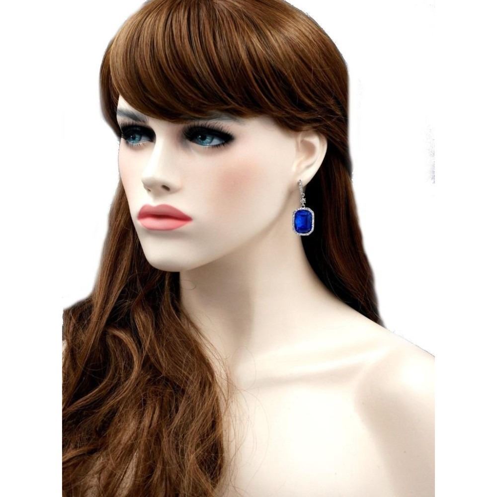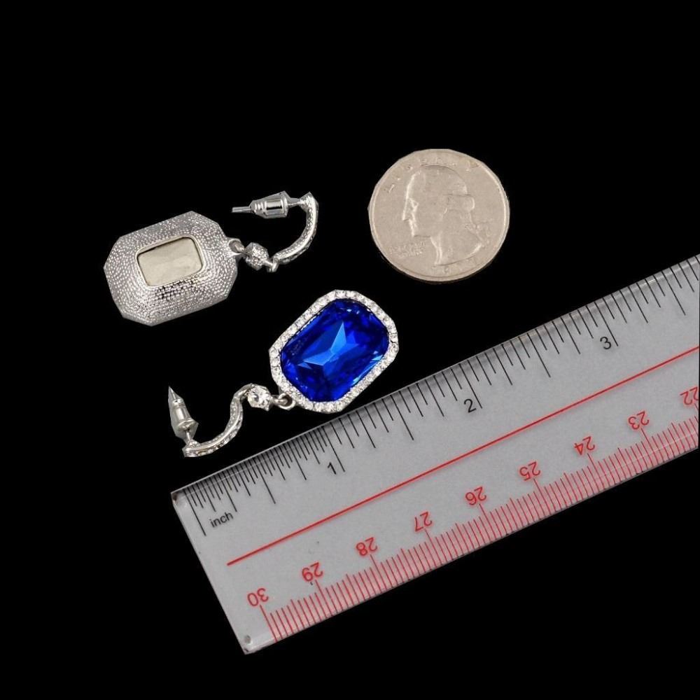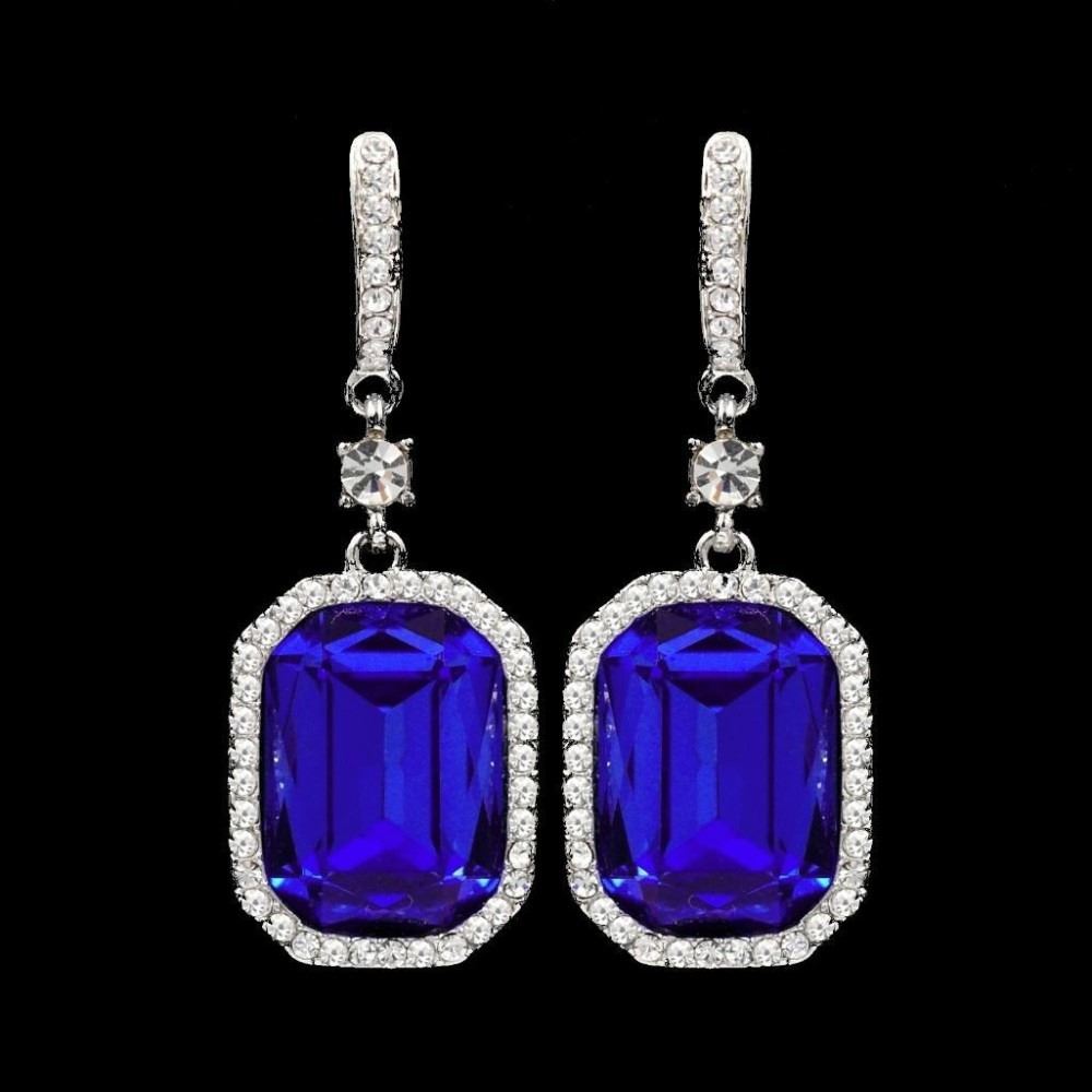 Type: Pierced earrings. Stone / Color: Czech crystal / Blue (Sapphire), Clear. Metal / Color: Rhodium plated / Rhodium. Length: 1.75". Weight: One earring is 0.19 oz. Quantity: 1 pair