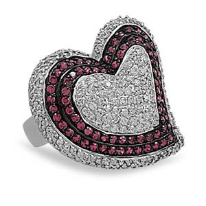 Rhodium plated sterling silver heart shape ring with clear and red CZs. There are a total of 260 2mm CZs in the heart. The heart measures 30mm and the band measures 4mm. This ring is available in whole sizes 6-9.