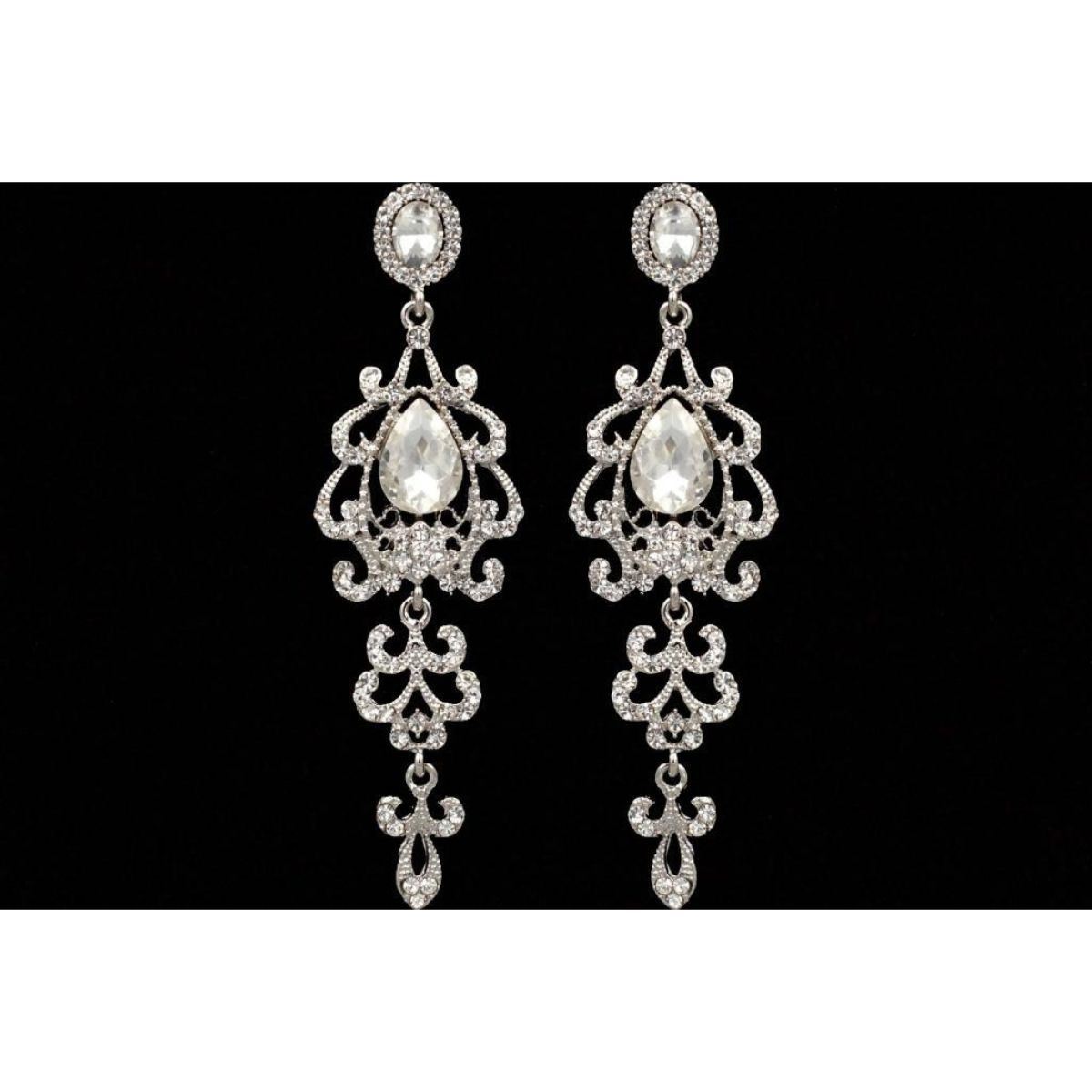 Clear Czech pear & oval focal crystals embedded into European-style crystal encrusted fretwork chandelier drop 3 1/2" length earrings.  9796-031018-EB-85792