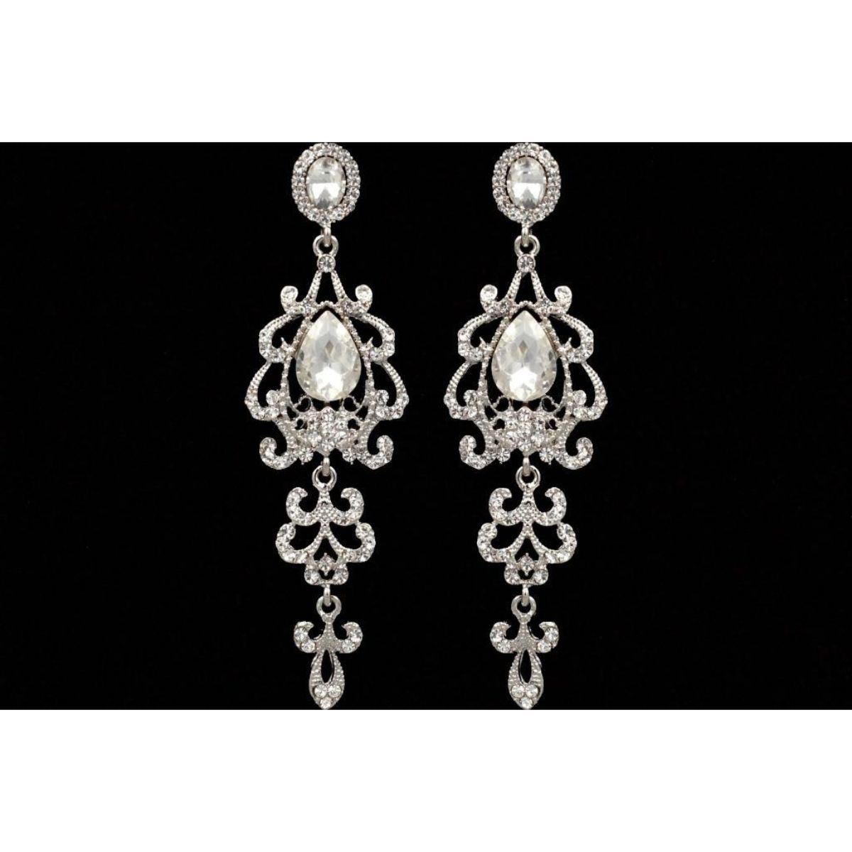 Clear Czech pear & oval faceted crystals set in European-style rhodium-plated fretwork-style chandelier drop dangle 3 1/2" length earrings.  -9796-031018-EB-85792