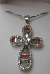 Rhodium Plated Cross Pendant with Multi-colored Baguette and Round Cubic Zirconia on 18" Chain in a Gift Box