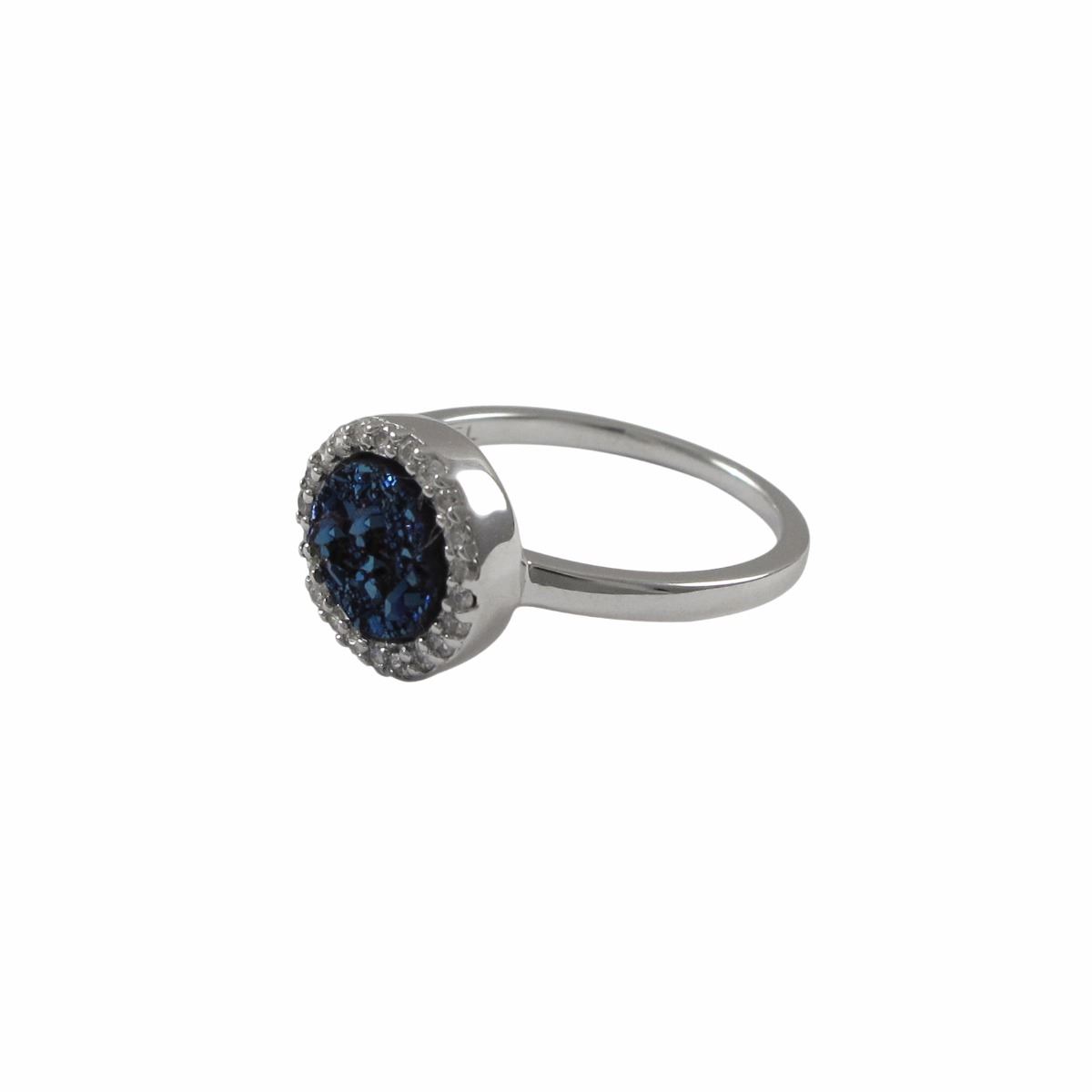 Rhodium Plated Sterling Silver, 11Mm Round Circe, 8Mm Blue Druzy Natural Stone With CZ Border, Ring Size 6