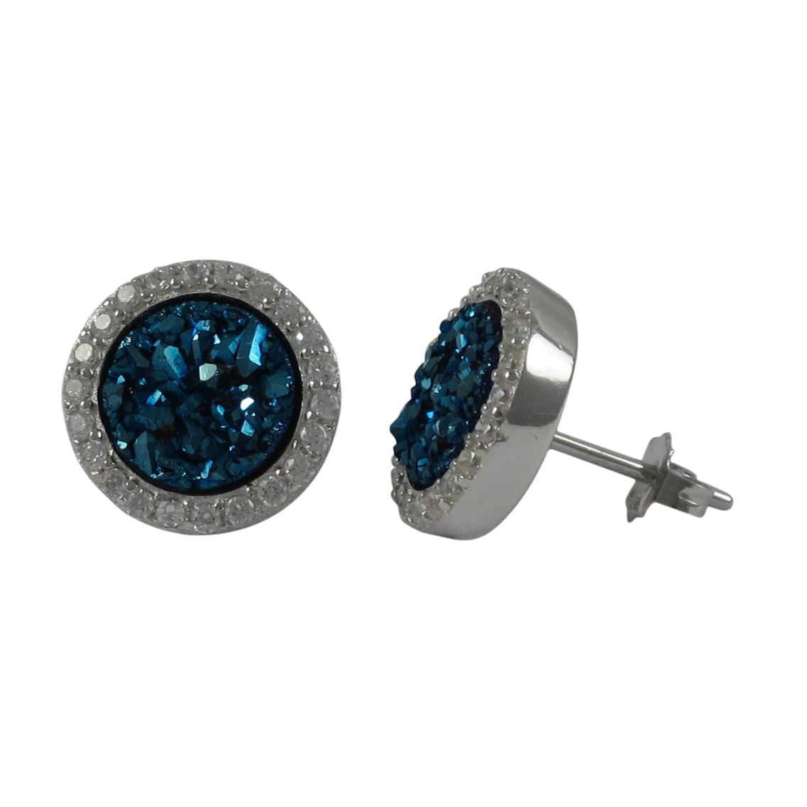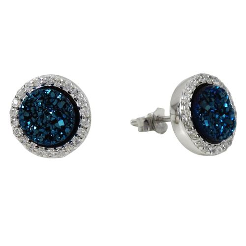 Rhodium Plated Sterling Silver, 11Mm Round Circle, Blue 8Mm Druzy Natural Stone With CZ Border, Post