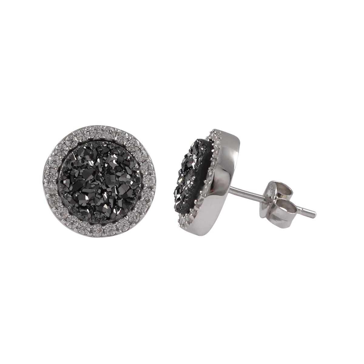 Rhodium Plated Sterling Silver, 11Mm Round Circle, Grey 8Mm Druzy Natural Stone With CZ Border, Post