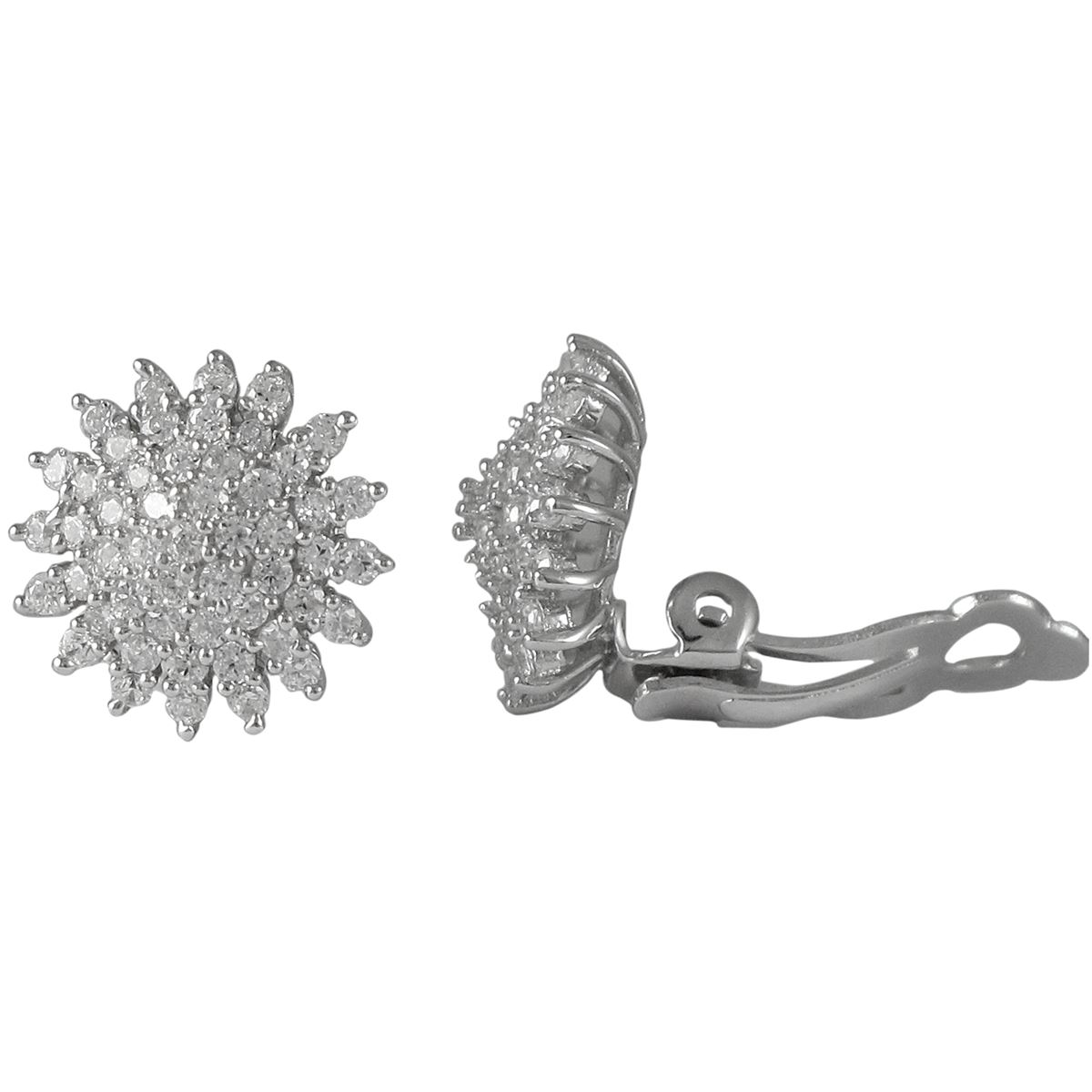 Rhodium Plated Sterling Silver, 14Mm Starburst CZ Circle, Clip Earrings