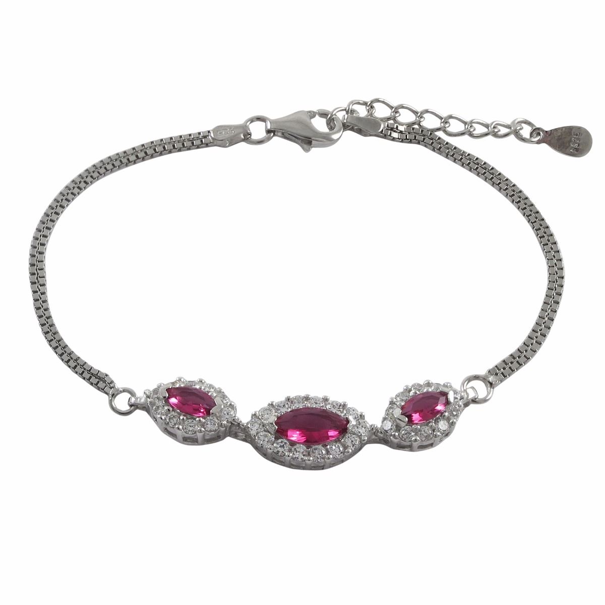 Rhodium Plated Sterling Silver, 3 Ruby Marquise Shaped CZ With White CZ Border, Two Row Box Chain, Bracelet, 6.5" 1"