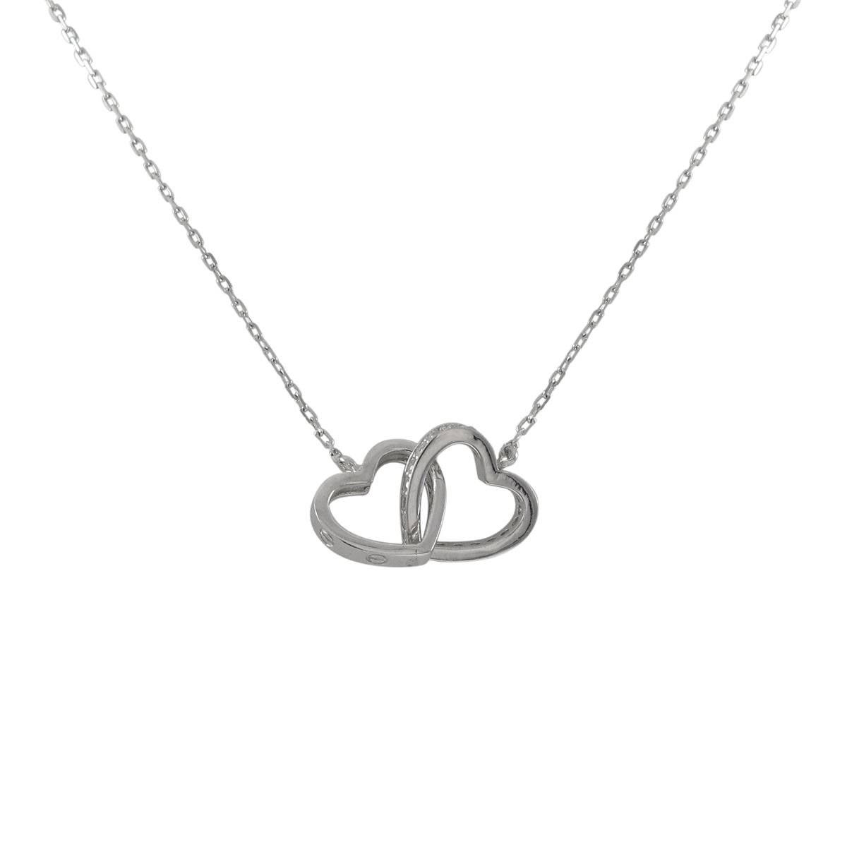Rhodium Plated Sterling Silver, AAA CZ Interlocking 10X10mm Hearts, Necklace, 17" 1"
