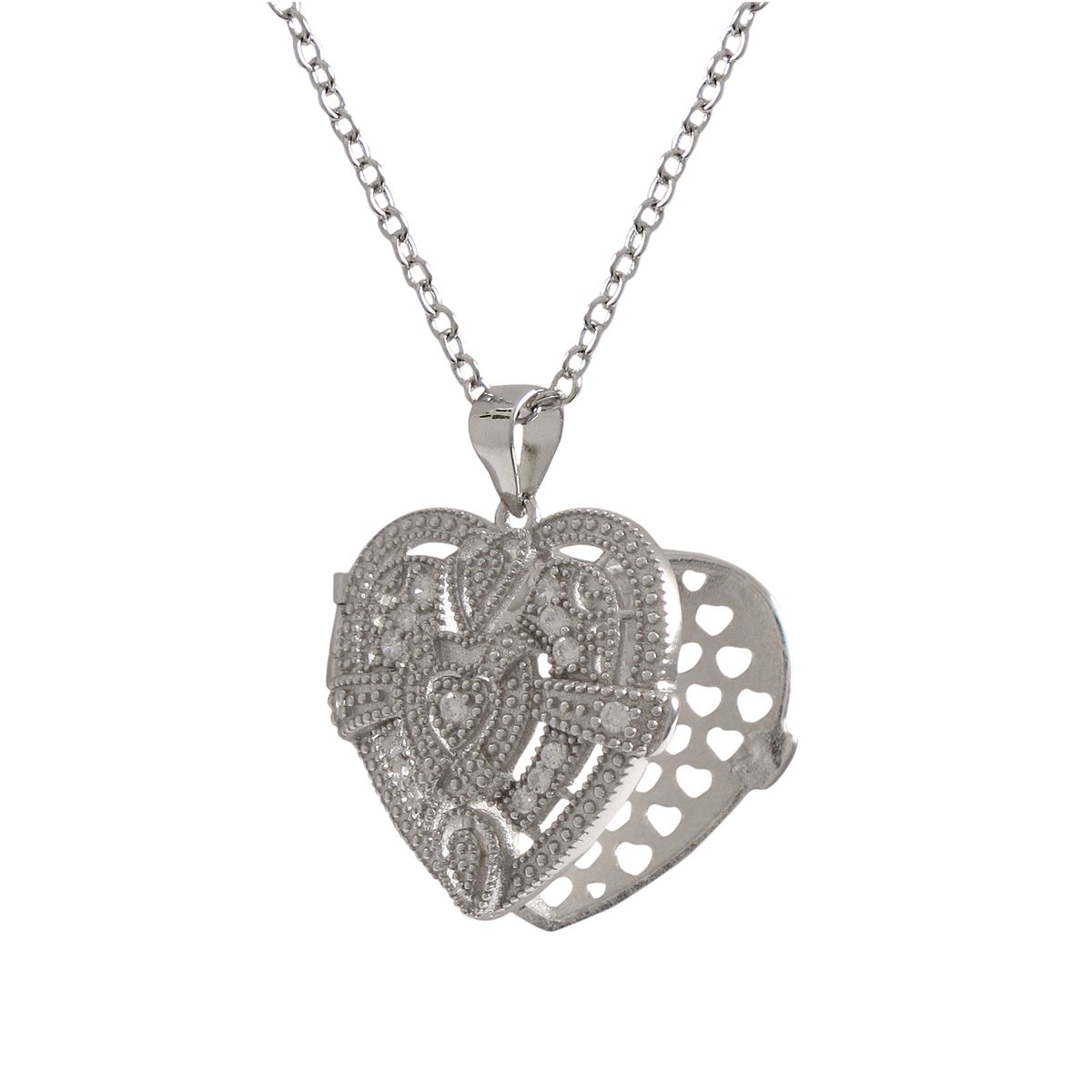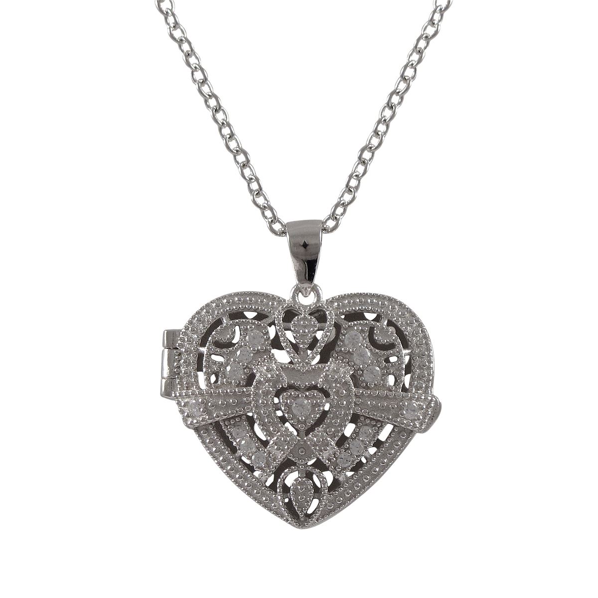 Rhodium Plated Sterling Silver, CZ Filigree Heart Locket Pendant