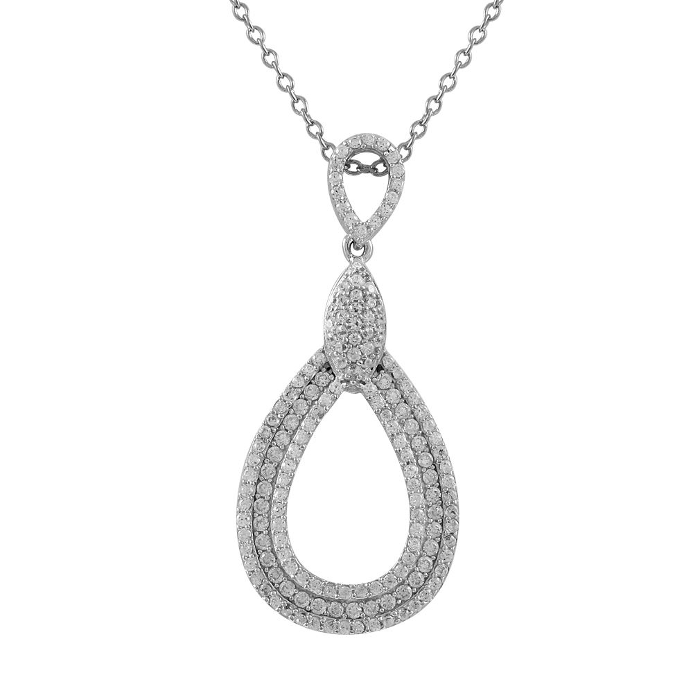 Rhodium Plated Sterling Silver Dangling Open Teardrop Shape Pendant With CZ, 1.81"