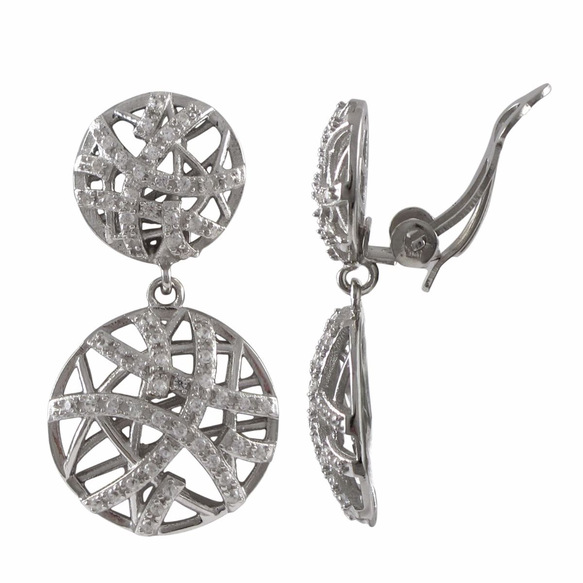 Rhodium Plated Sterling Silver Double Circle CZ Clip Earrings, 1.22&Quot;