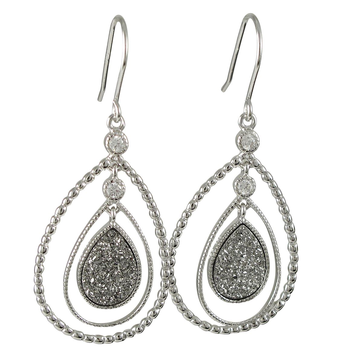 Rhodium Plated Sterling Silver, Grey Teardrop Druzy, CZ Wire Earrings
