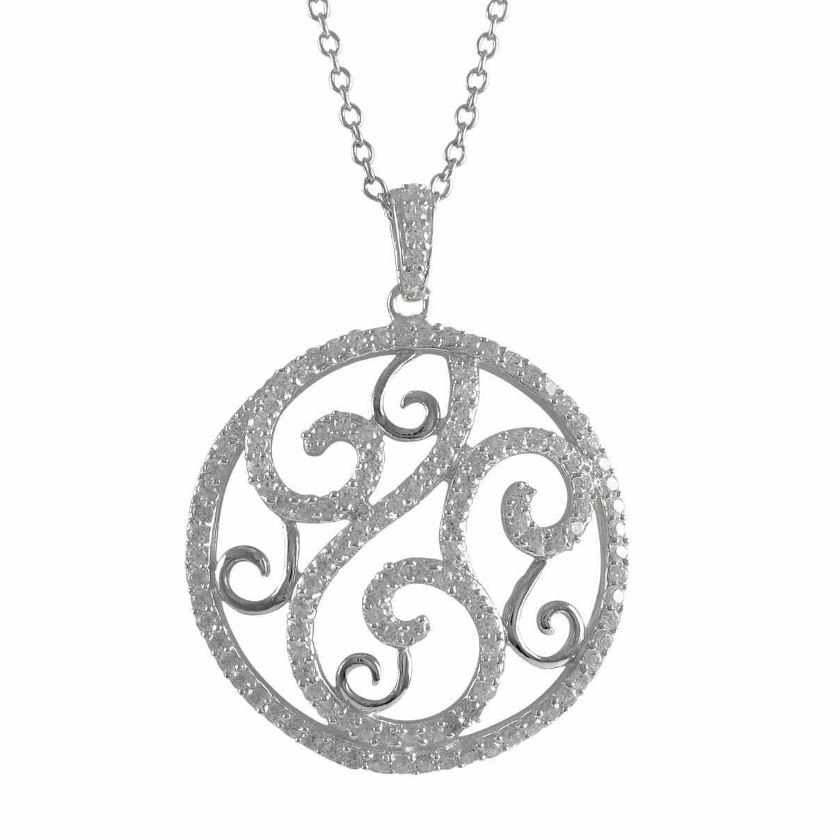 Rhodium Plated Sterling Silver Pendant, Swirl Design With White Czs, 42Mm Long, Circle Is 32Mm Wide