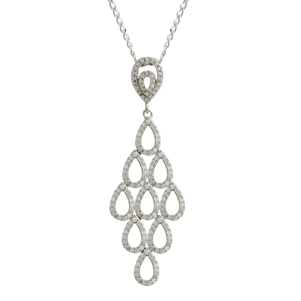 Rhodium Plated Sterling Silver, Teardrop Cluster In Diamond Shape CZ Pendant, 53Mm Long