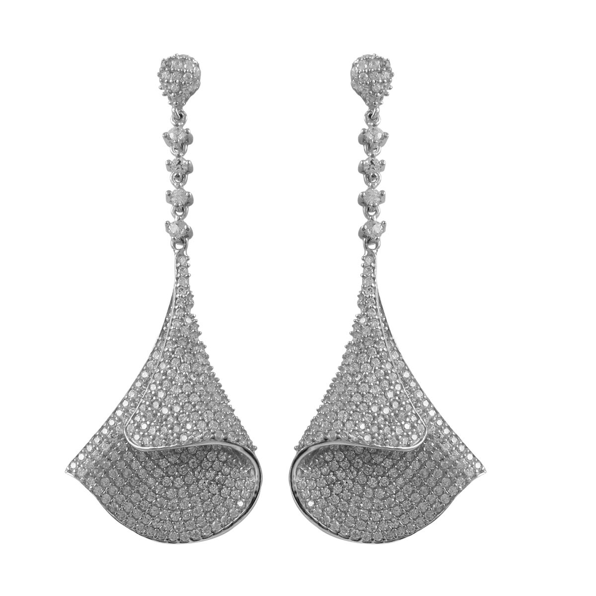 Rhodium Plated Sterling Silver, Upside Down Cone Shape Post Earrings With CZ Pave, 2.36&Quot;