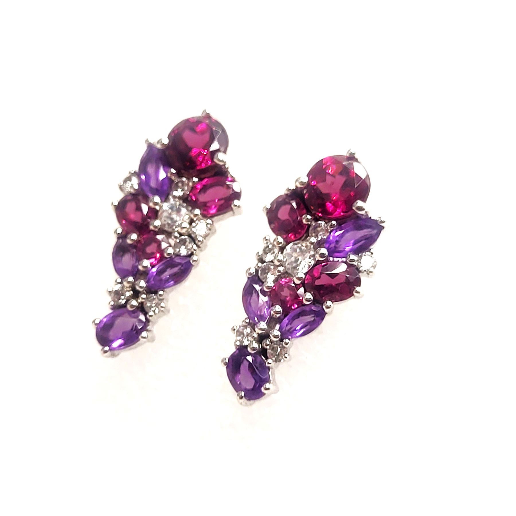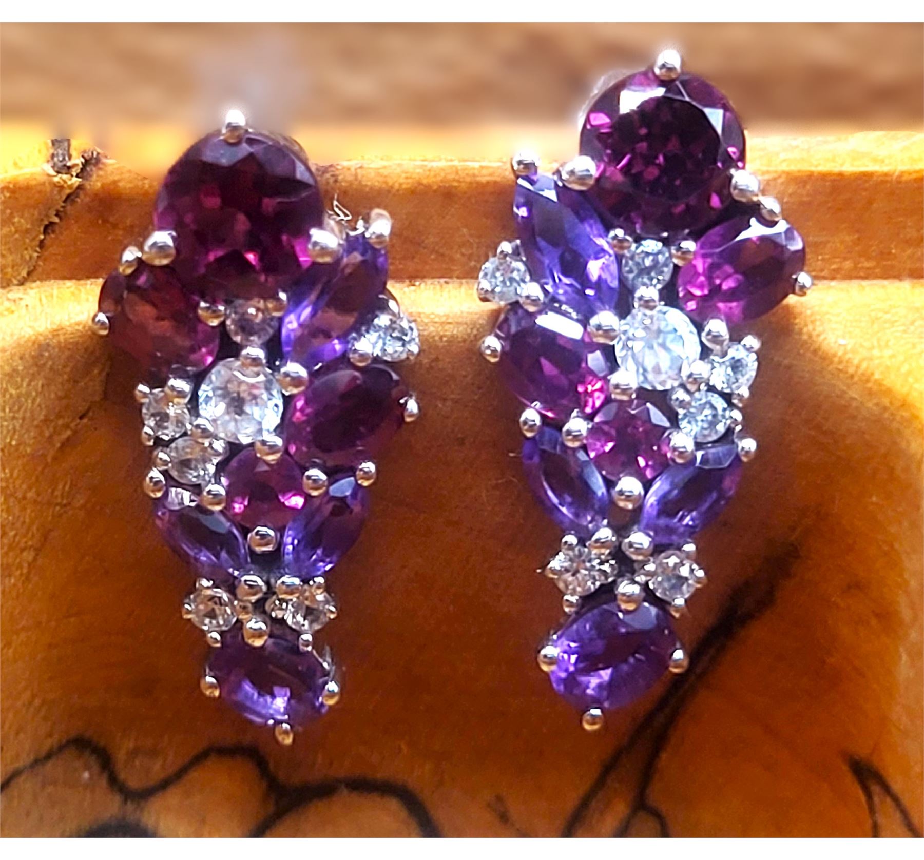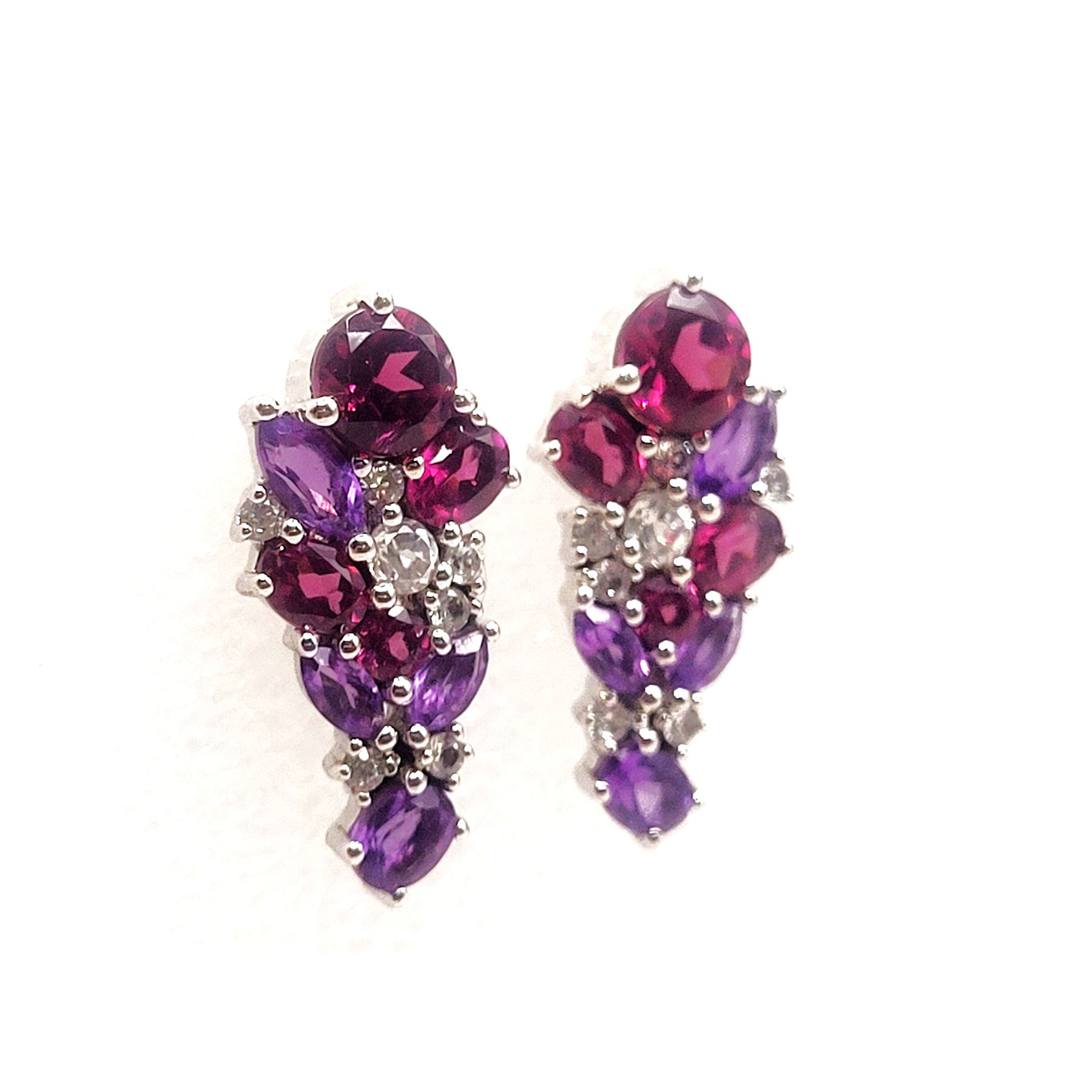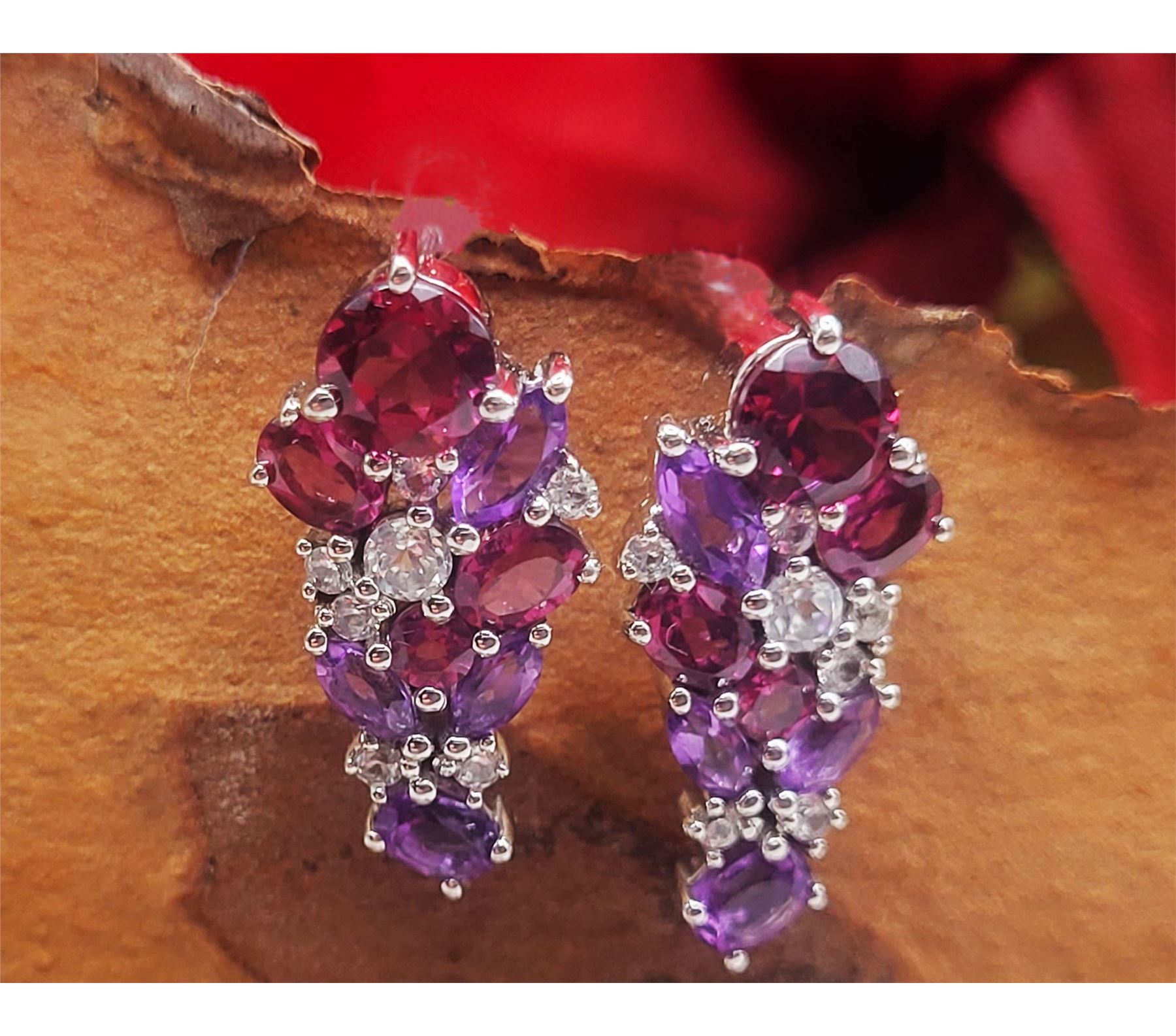 These sterling silver earrings are perfect for everyday wear. The rich shades of purple and burgundy shown in the 1.58 carats total weight oval- and marquise-cut genuine amethysts and 1.91 carats total weight of round- and oval-cut genuine rhodolite garnets say "wear me in any season". The contrasting gleaming sparkle provided by the .36 carats total weight round, faceted, genuine white zircon, give the earrings the look of dew-covered grapes hanging from the vine in the morning sun, calling "Wear me to the wine-tasting event this weekend"! Less than 1" long, they are easy for you to wear, but hard for everyone else to take their eye off of! These earrings attach to the earlobe with posts and friction backs. 4g. AdminCode: 6282/33-gr