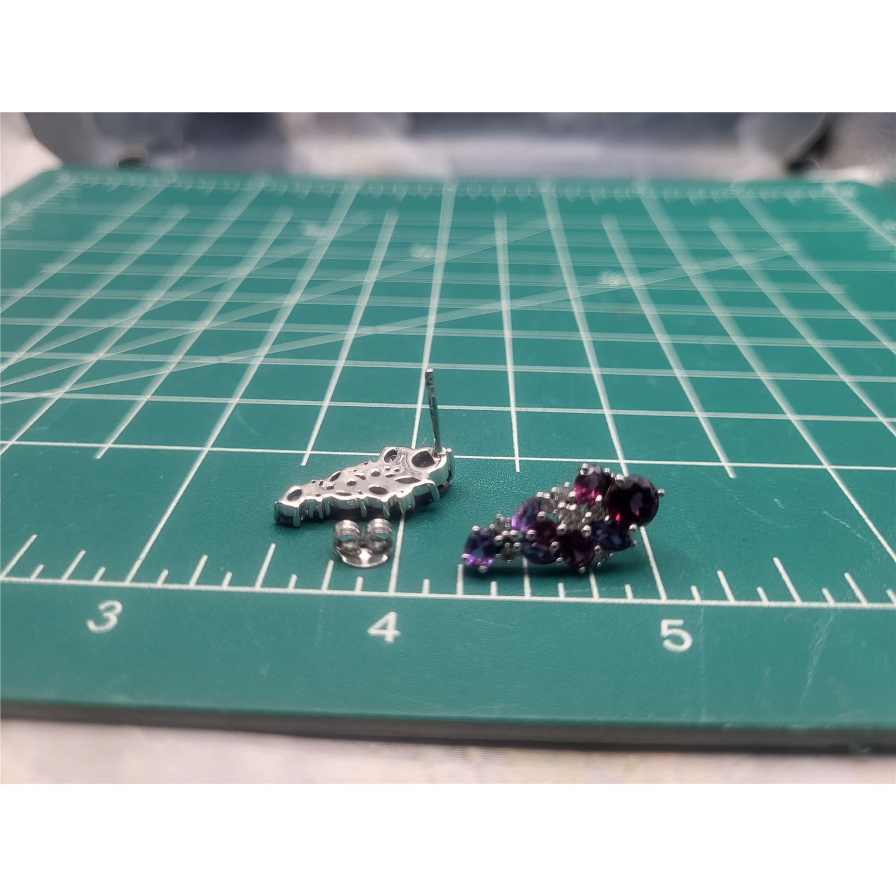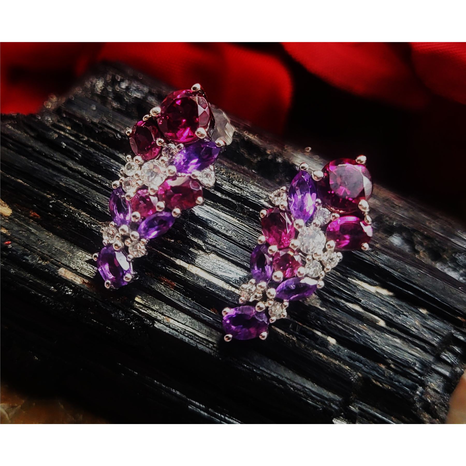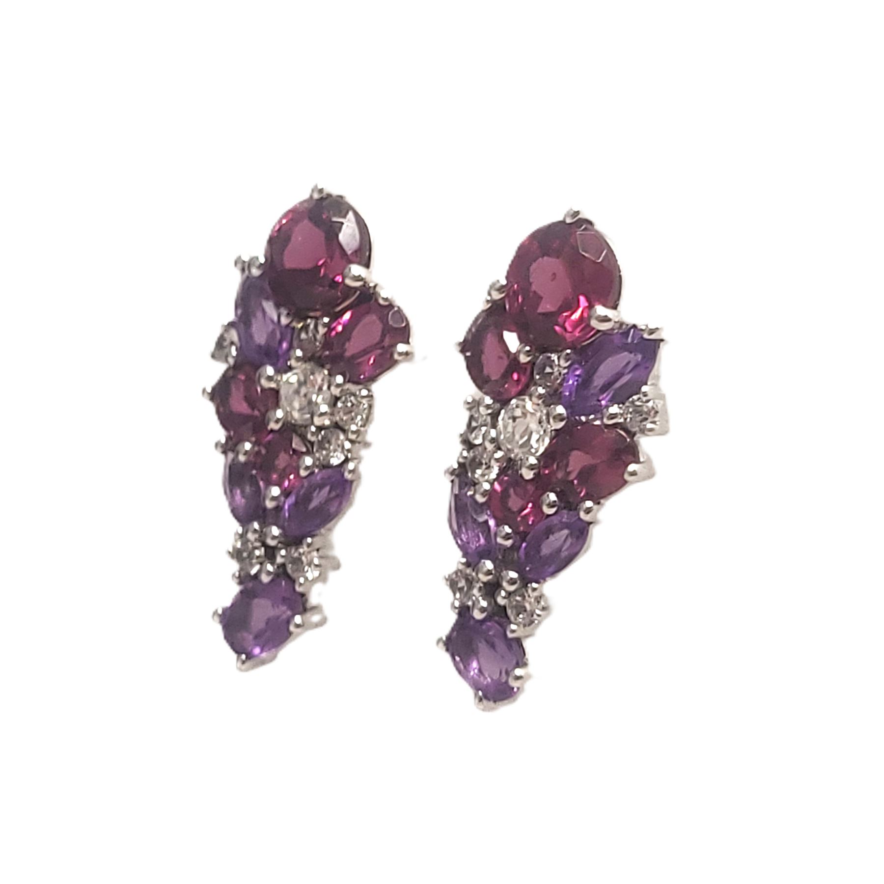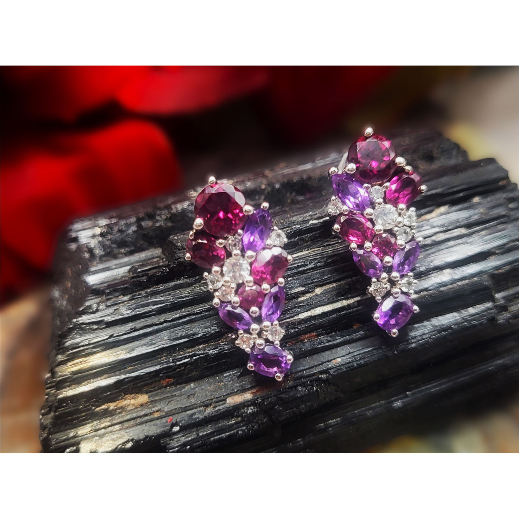 These sterling silver earrings are perfect for everyday wear. The rich shades of purple and burgundy shown in the 1.58 carats total weight oval- and marquise-cut genuine amethysts and 1.91 carats total weight of round- and oval-cut genuine rhodolite garnets say "wear me in any season". The contrasting gleaming sparkle provided by the .36 carats total weight round, faceted, genuine white zircon, give the earrings the look of dew-covered grapes hanging from the vine in the morning sun, calling "Wear me to the wine-tasting event this weekend"! Less than 1" long, they are easy for you to wear, but hard for everyone else to take their eye off of! These earrings attach to the earlobe with posts and friction backs. 4g. AdminCode: 6282/33-gr