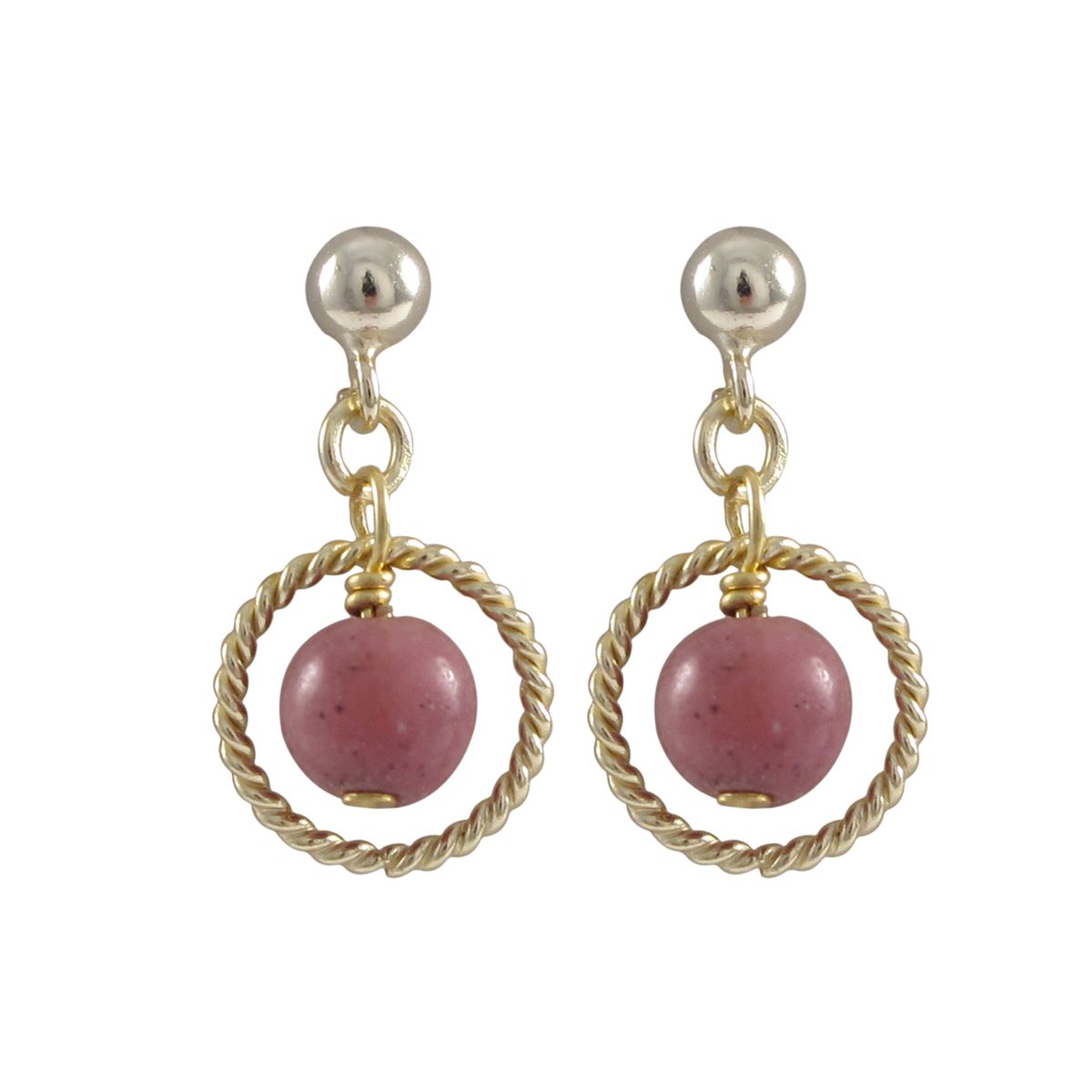 Rhodonite(Pink) 6Mm Semi Precious Ball In 10Mm Braided Ring, On Gold Plated Sterling Silver Ball Post Earrings, 0.75"