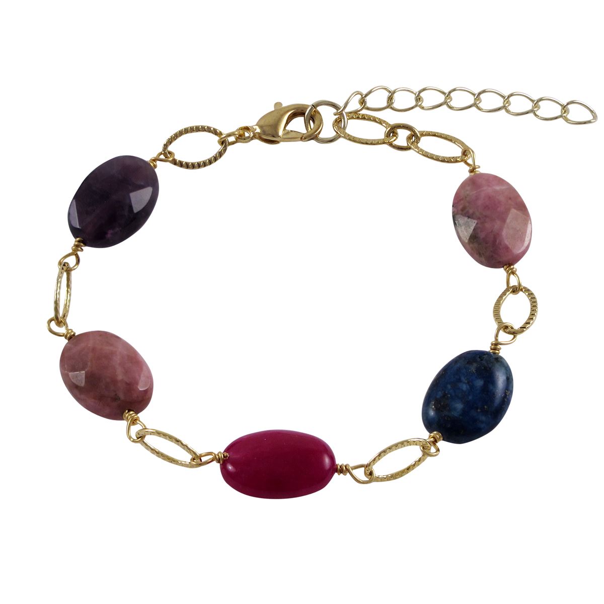 Rhodonite(Pink) Combination Of Semi Precious Stones On Gold Tone Brass Bracelet- 6.5" 1"