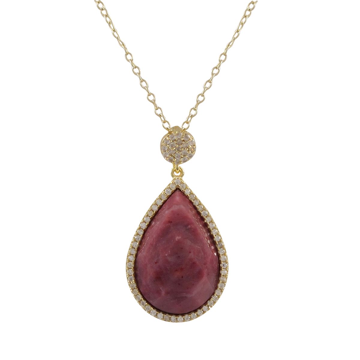 Rhodonite(Pink) Semi Precious 13X20 Faceted Teardrop Stone, Gold Plated Sterling Silver CZ Pendant, 1.26"