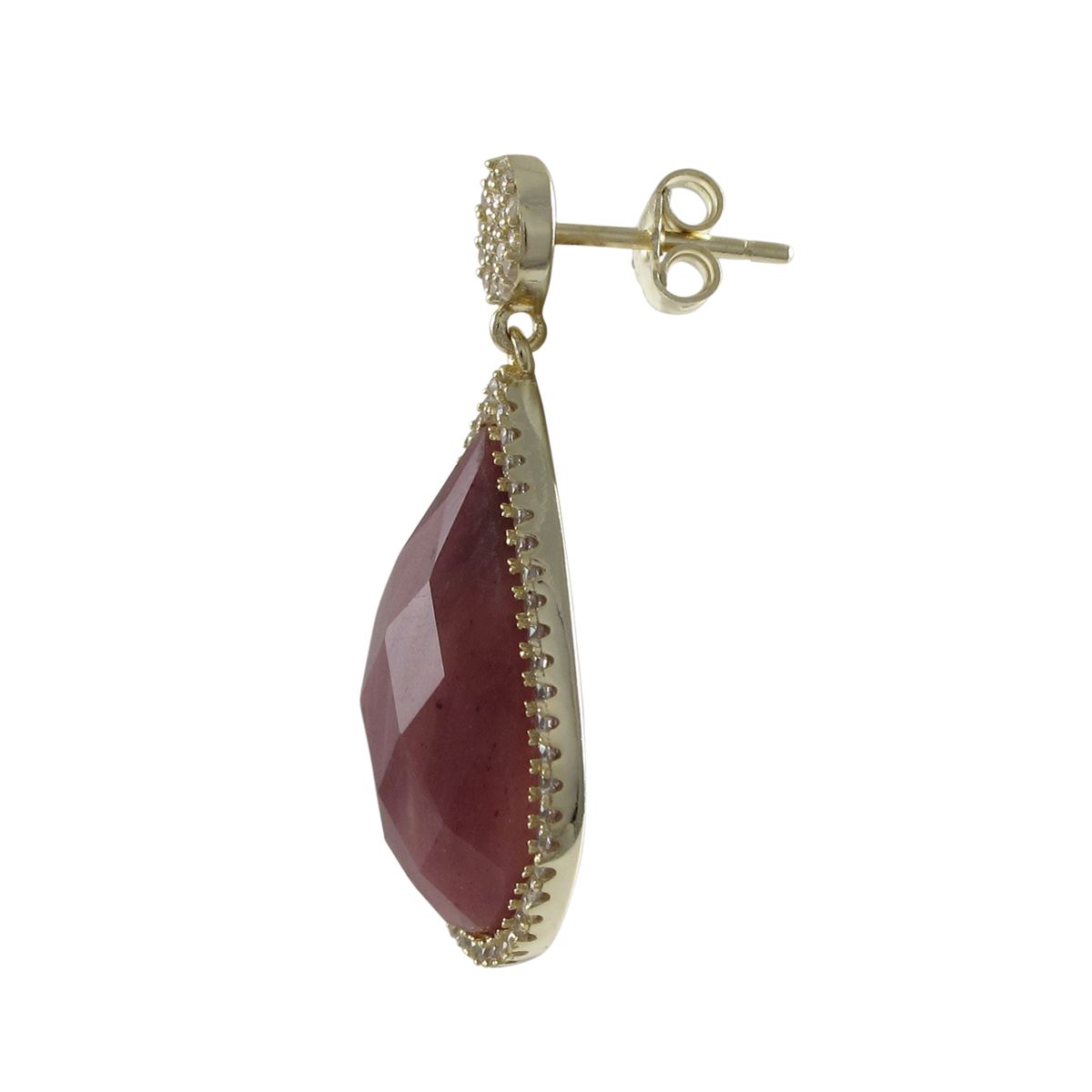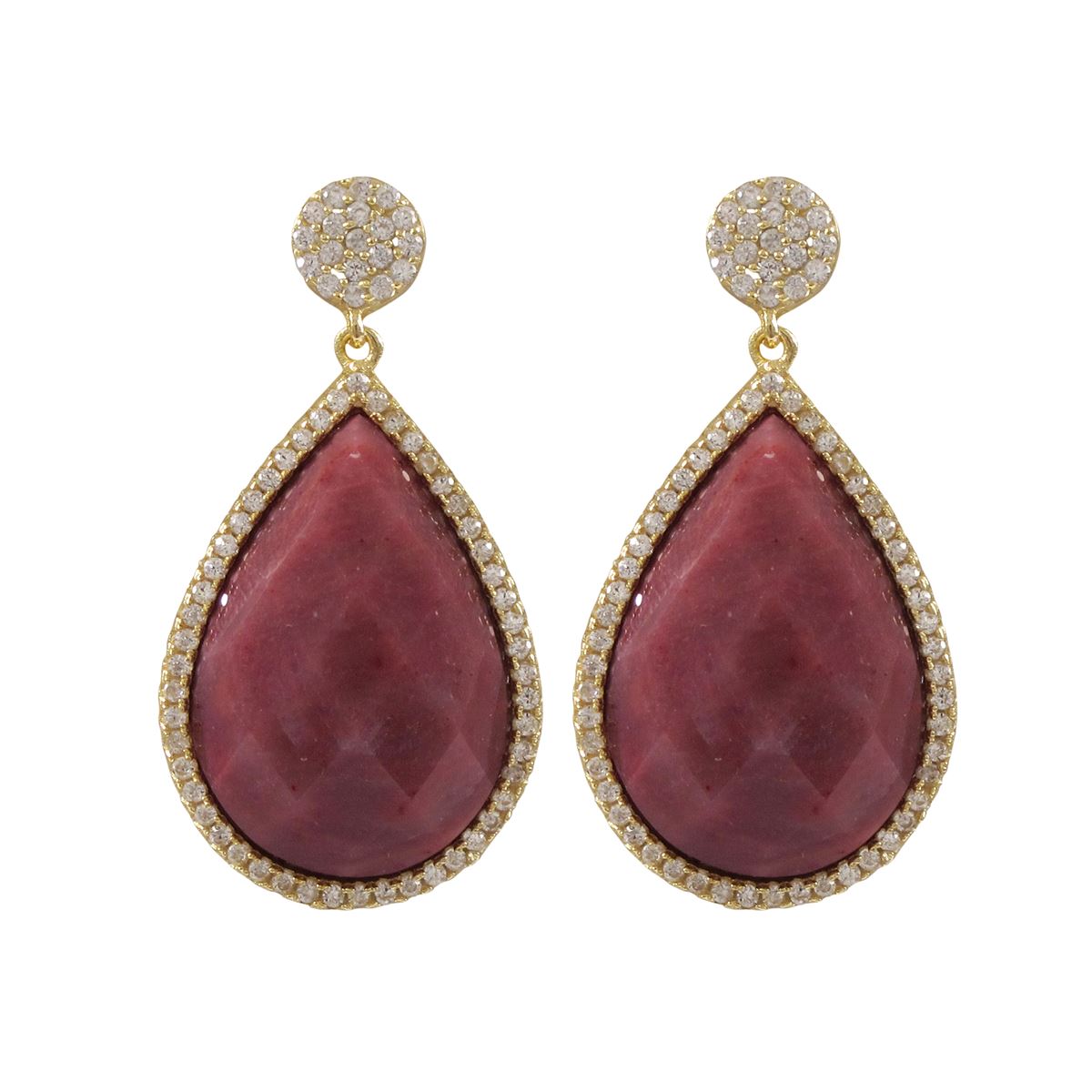 Rhodonite(Pink) Semi Precious 13X20 Faceted Teardrop Stone, Gold Plated Sterling Silver CZ Post Earrings, 1.26&Quot;
