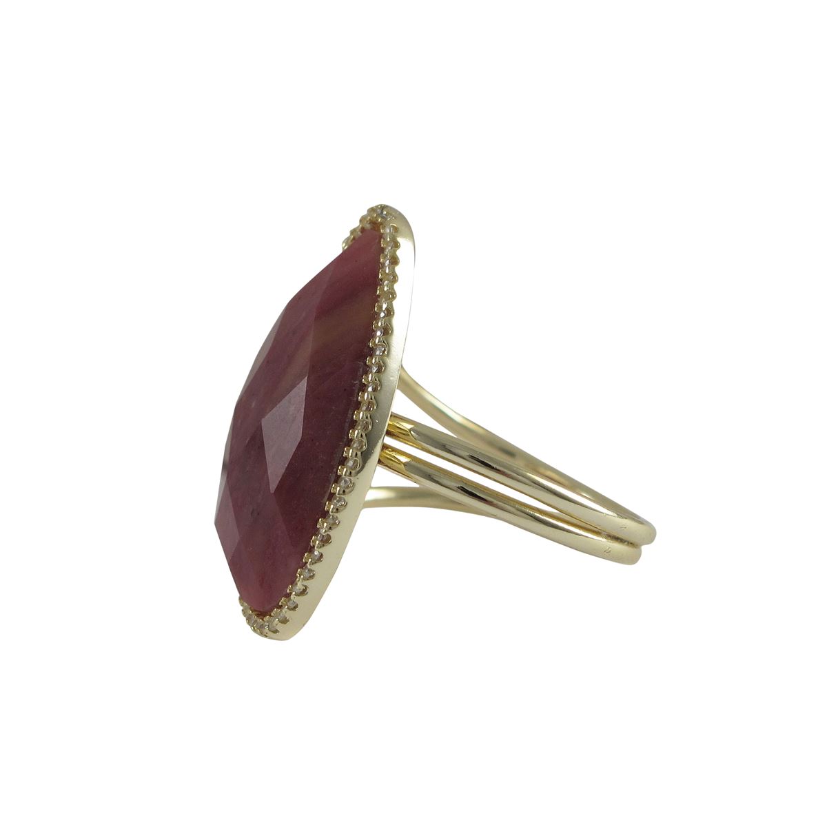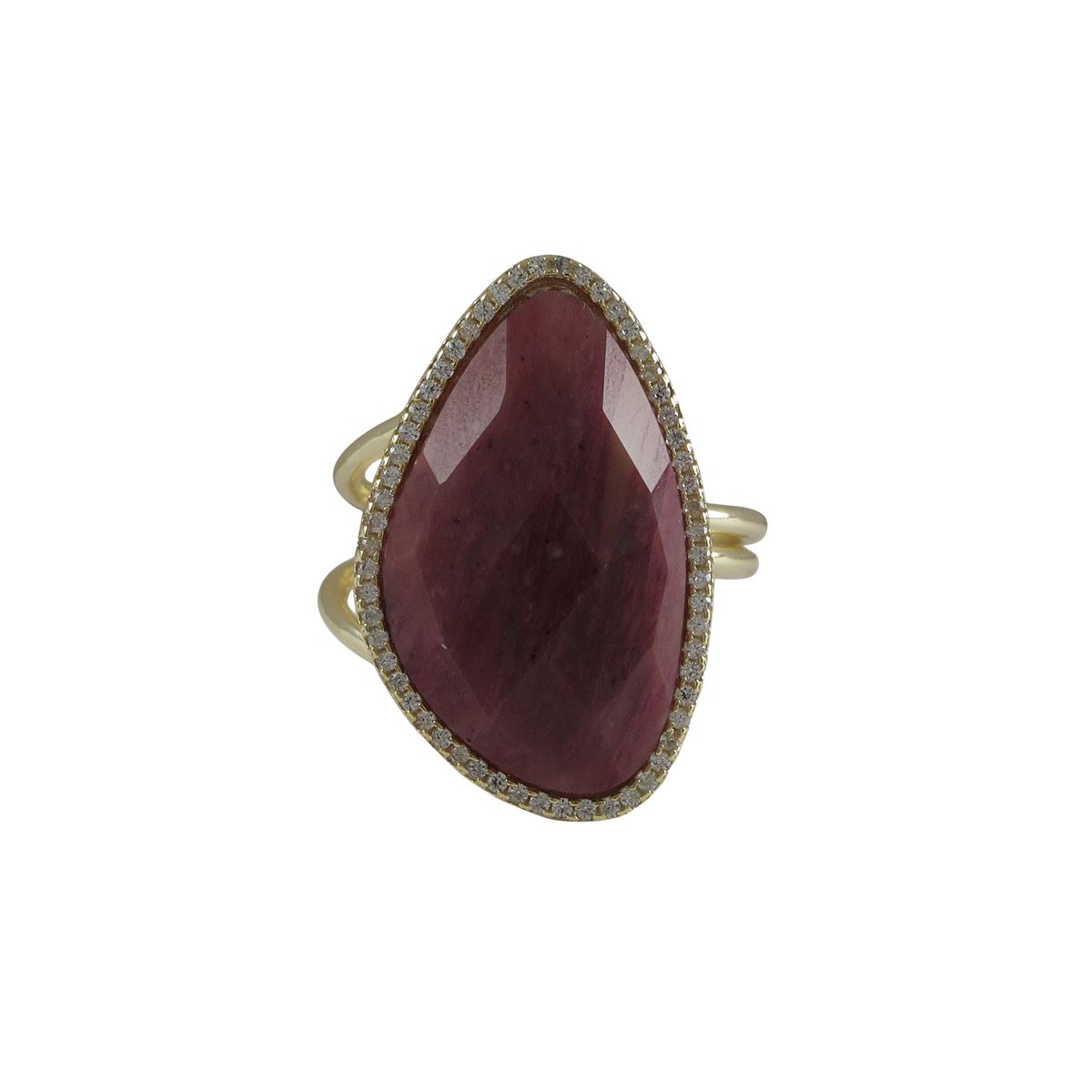 Rhodonite(Pink) Semi Precious Faceted Stone With CZ Border, On Gold Plated Sterling Silver Adjustable Ring, Size 5-9