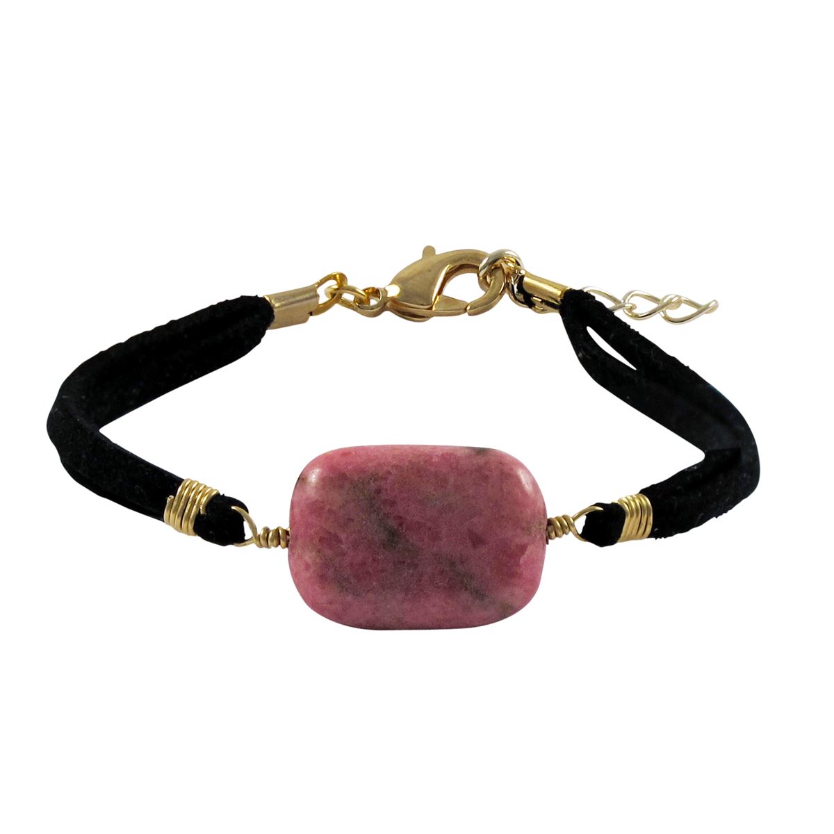 Rhodonite (Pink) Semi Precious Stone On Black Suede Chain Bracelet, 7" 1"